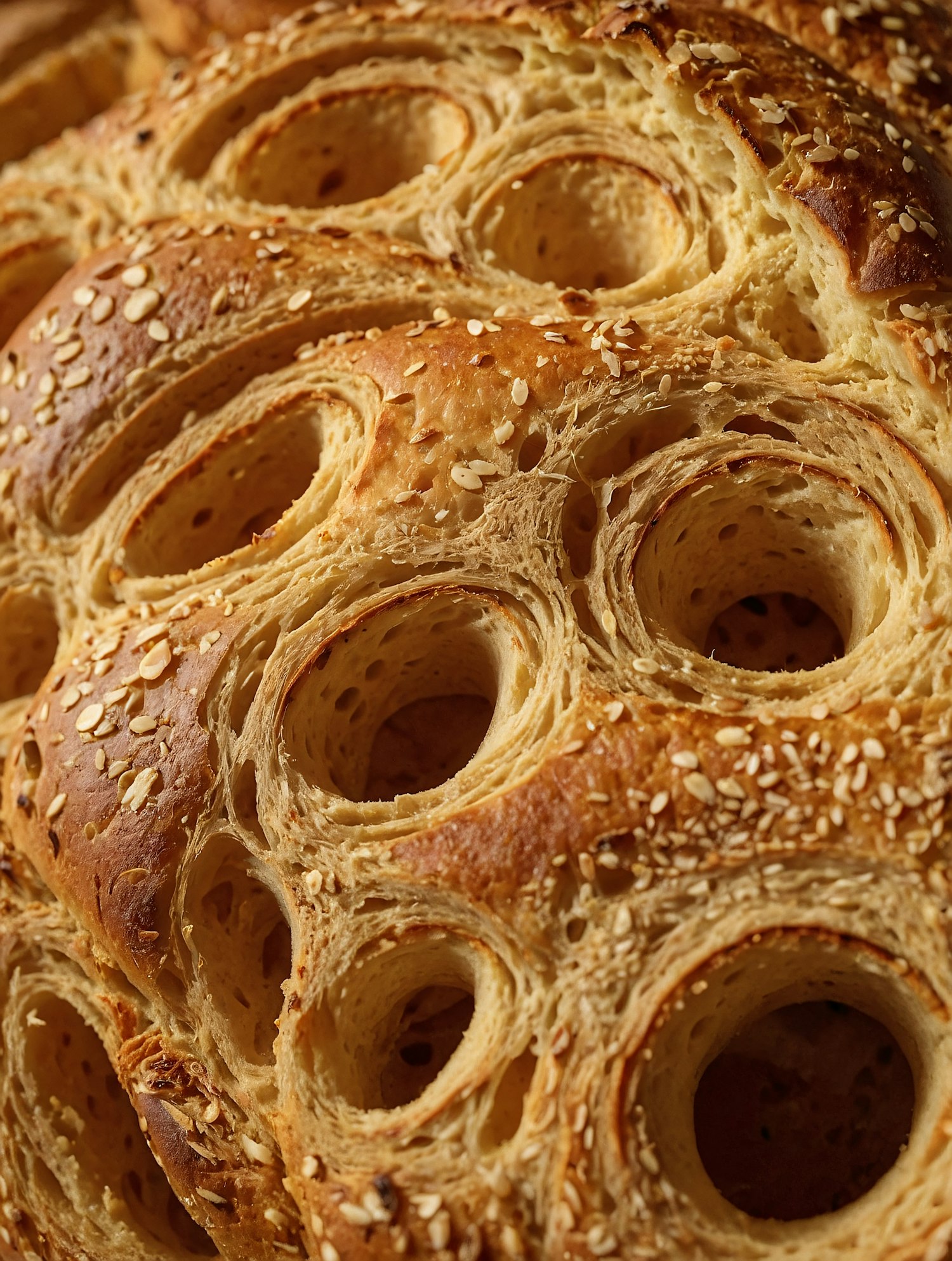 Close-up of golden-brown bread with circular holes, sesame seed topping, and a fluffy, layered texture. Perfect for artisanal bread lovers.