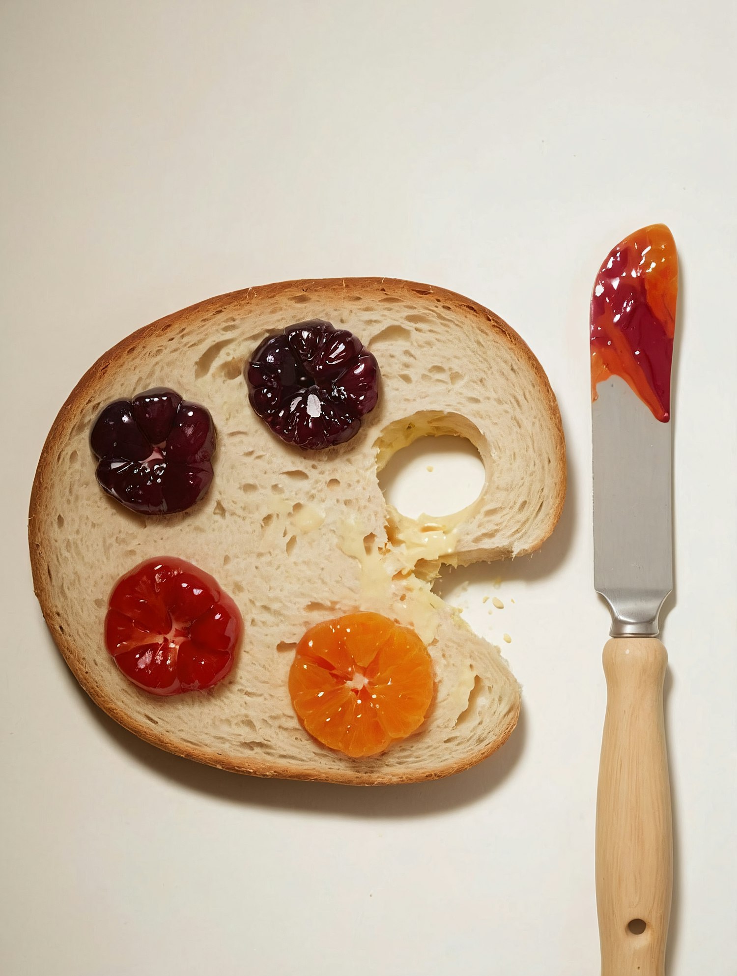 Creative bread styled as an artist's palette with colorful jams and marmalade, paired with a butter knife on a white background.