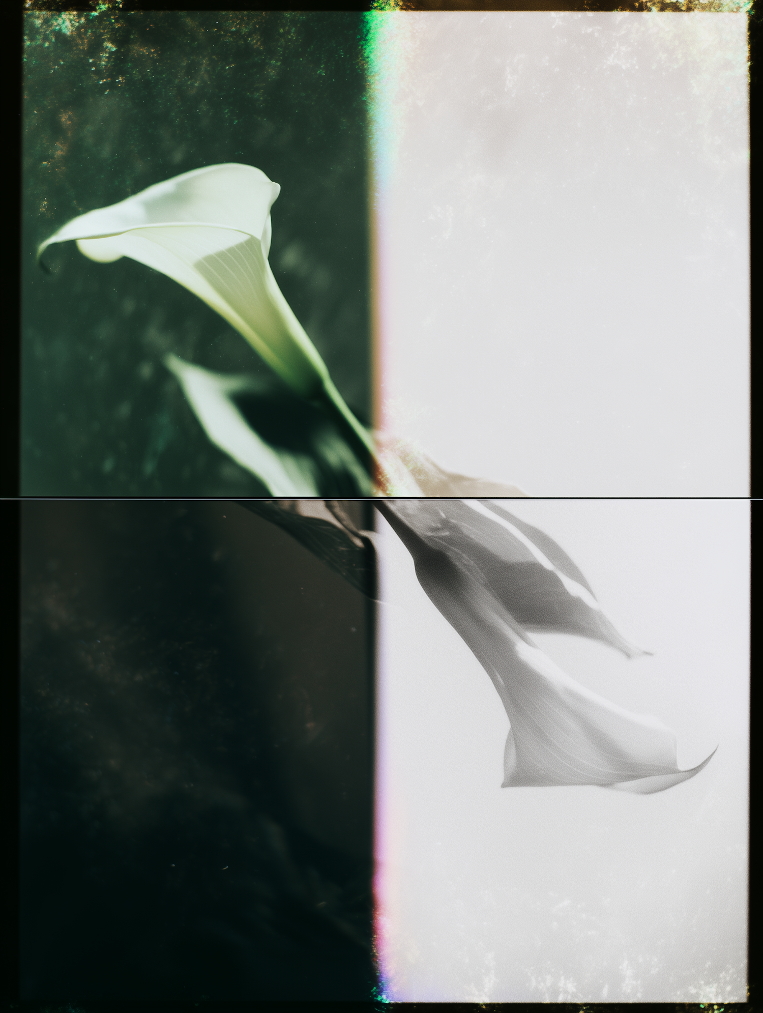Artistic split-tone photo of a white calla lily with green and monochrome halves, featuring a vintage light leak effect.