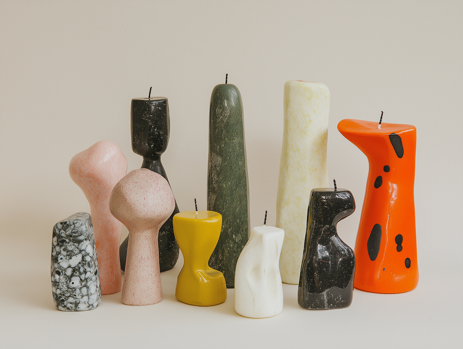 Artistic candles in abstract shapes and vibrant colors, including orange, green, and pink, arranged on a neutral background.