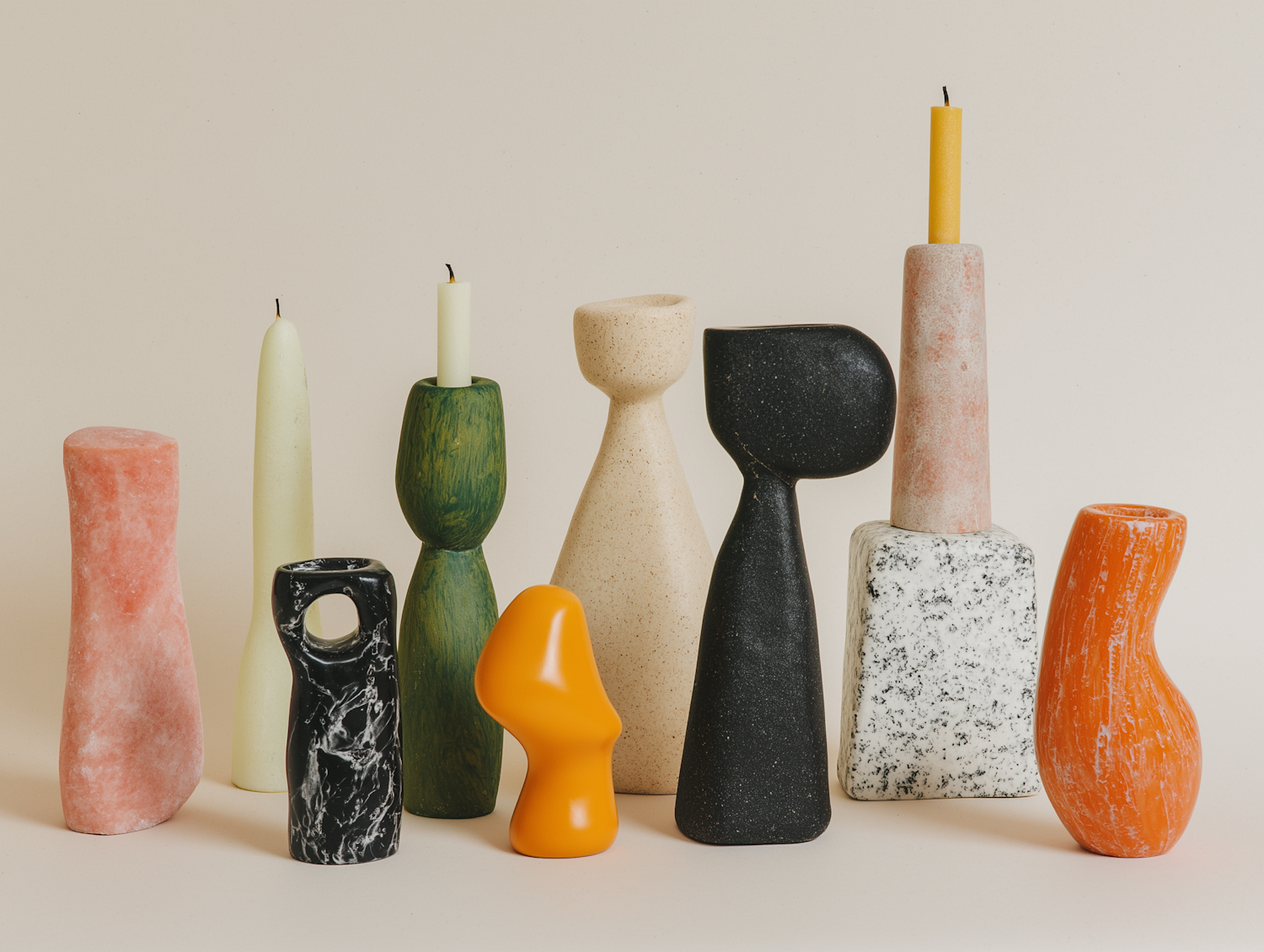 Artistic display of colorful, uniquely shaped candles and holders in various materials and abstract forms.