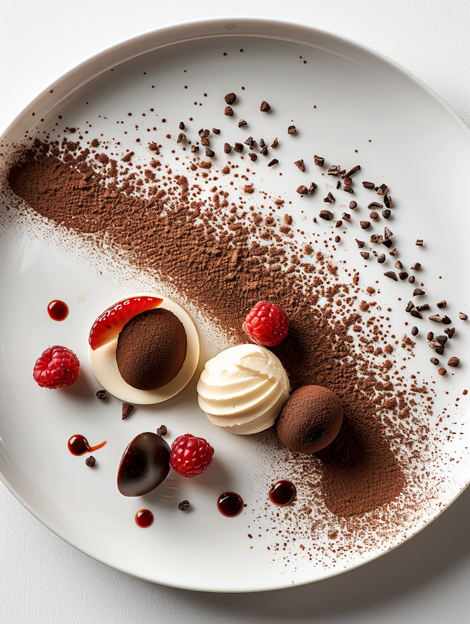 Artistic dessert plating with chocolate truffles, raspberries, and cocoa dust on a white plate.
