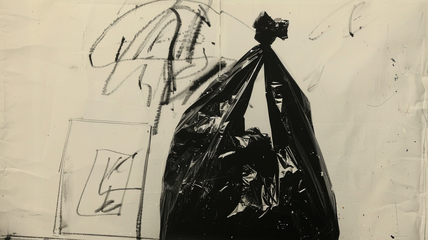 Abstract art featuring a black garbage bag against a scribbled background, creating a striking monochromatic contrast.