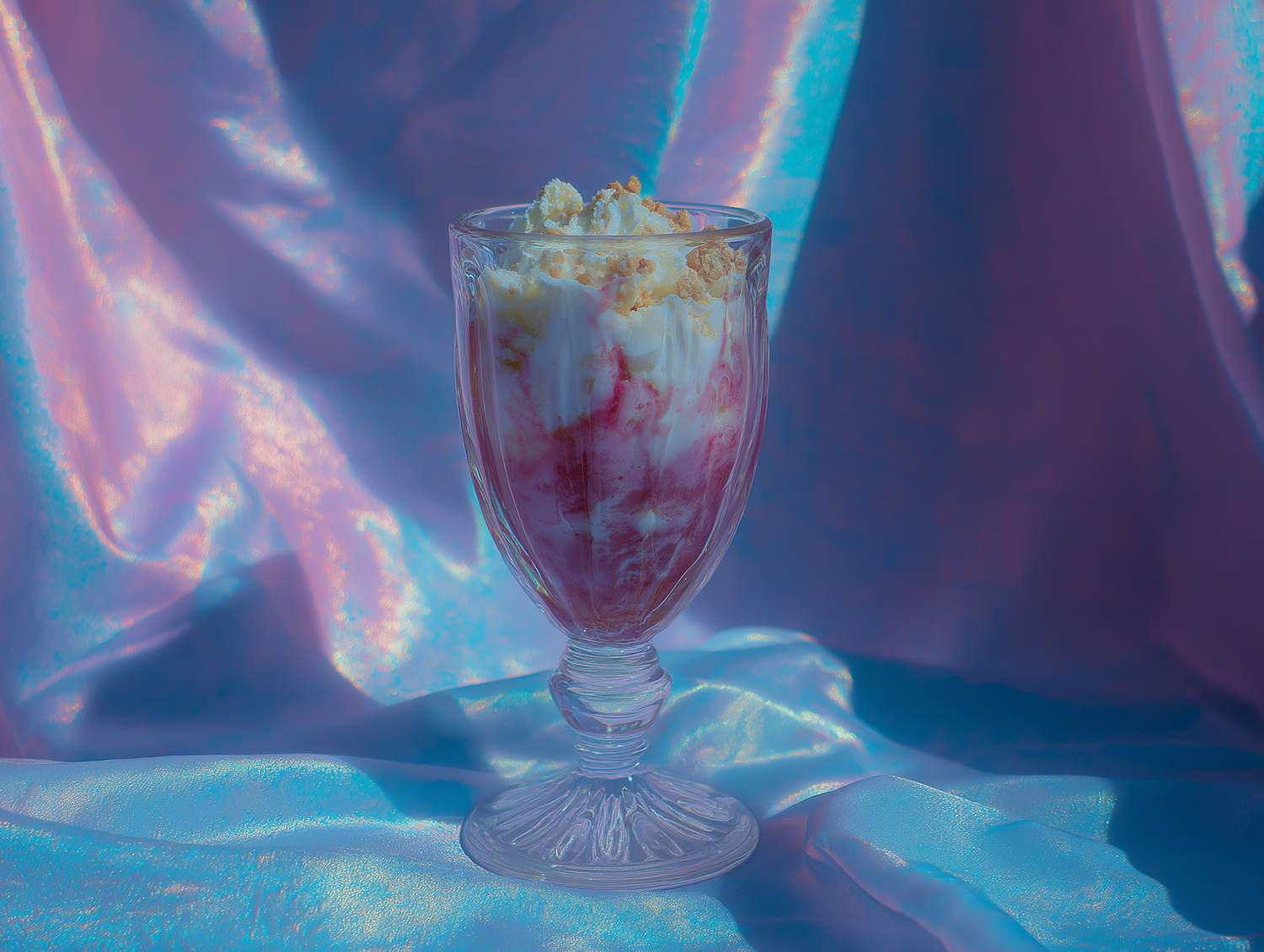 A decorative glass cup filled with a dessert of whipped cream blended with red sauce, set against an iridescent textile backdrop.