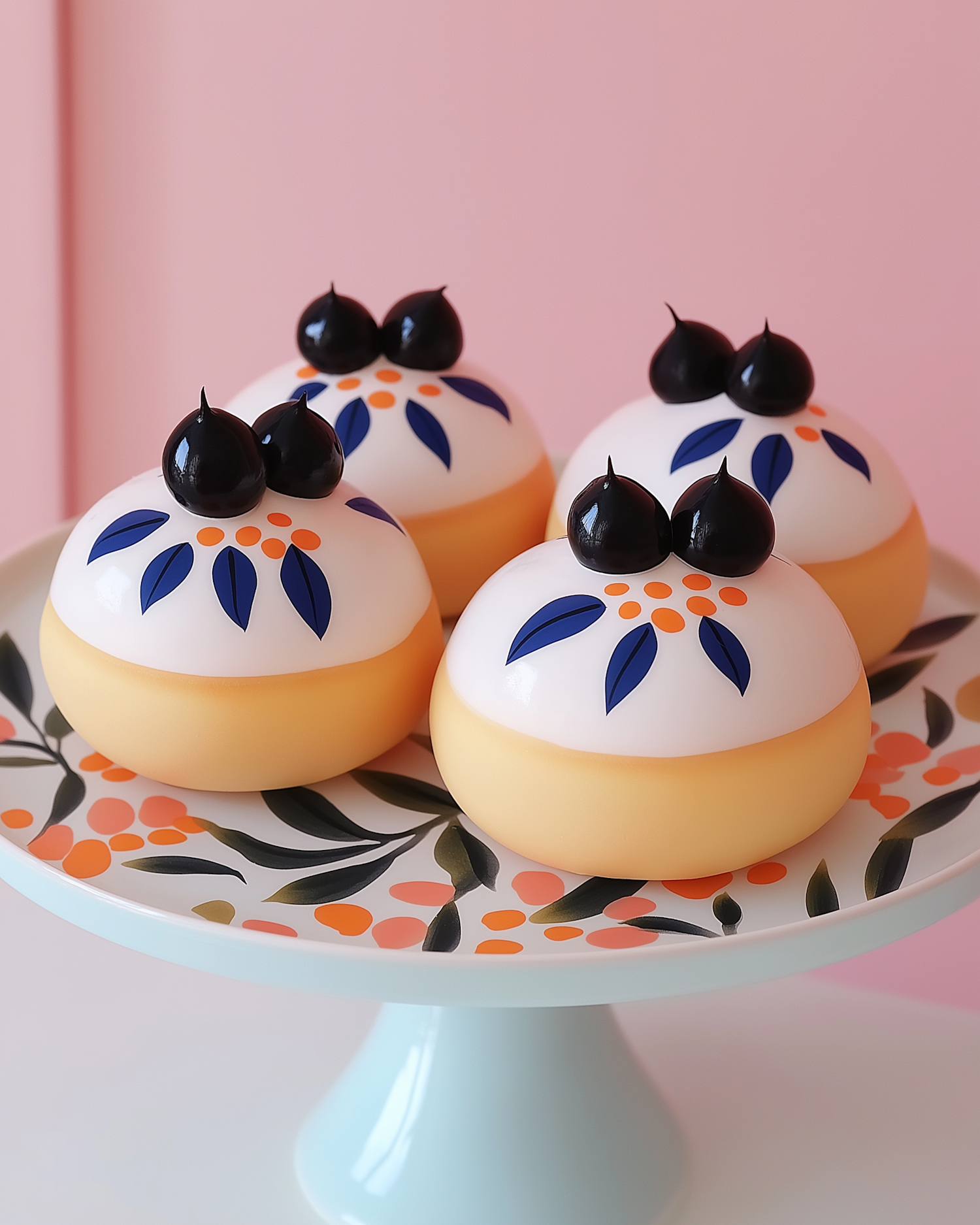 Elegant pastries with floral designs on a decorative cake stand against a soft pink background.