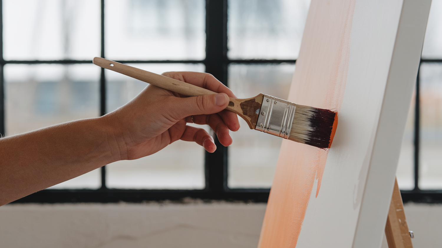Close-up of a hand painting a canvas with a brush, applying light orange strokes. Natural light from a window enhances the scene.