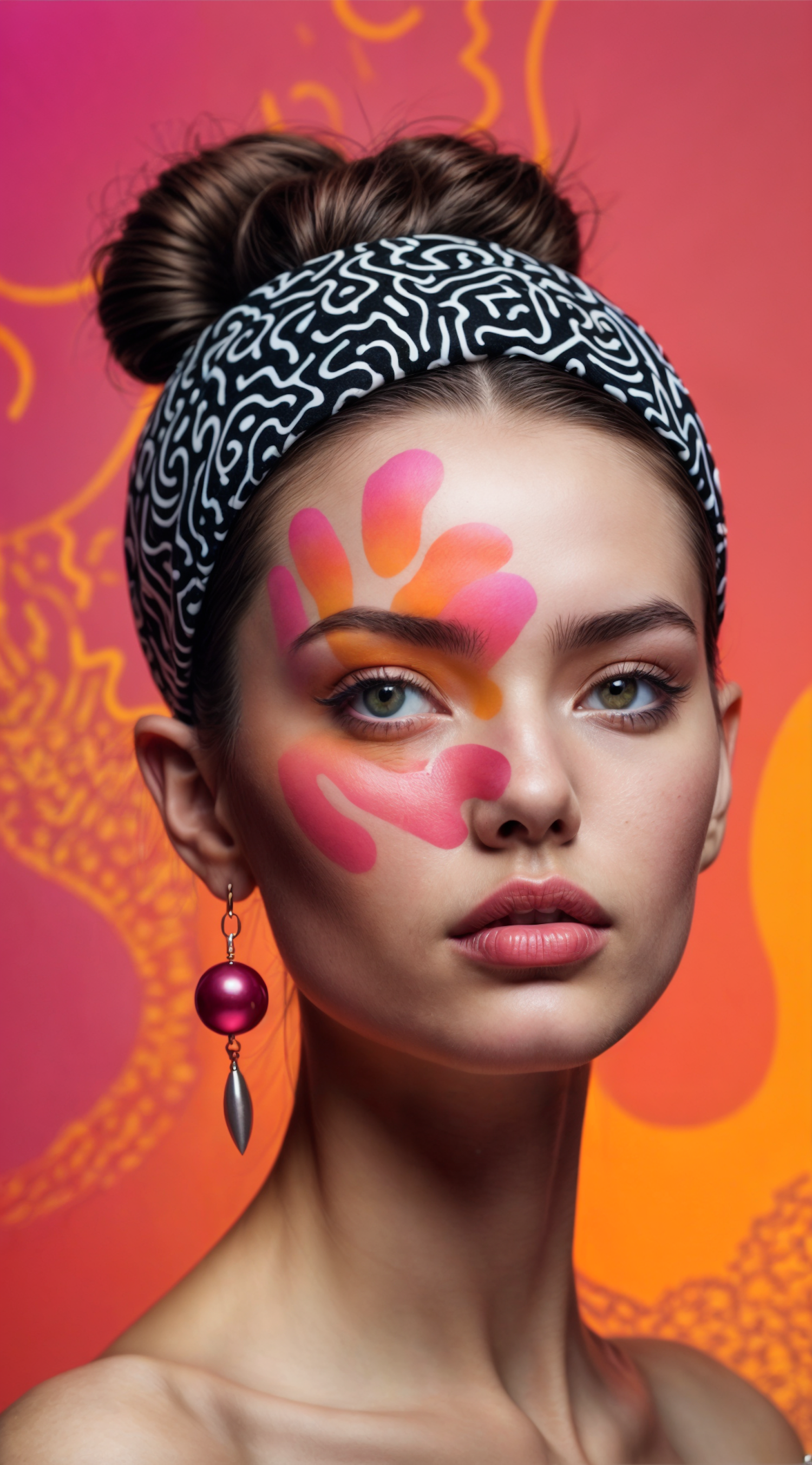 Artistic portrait of a woman with vibrant face paint and bold earring, set against a colorful background.