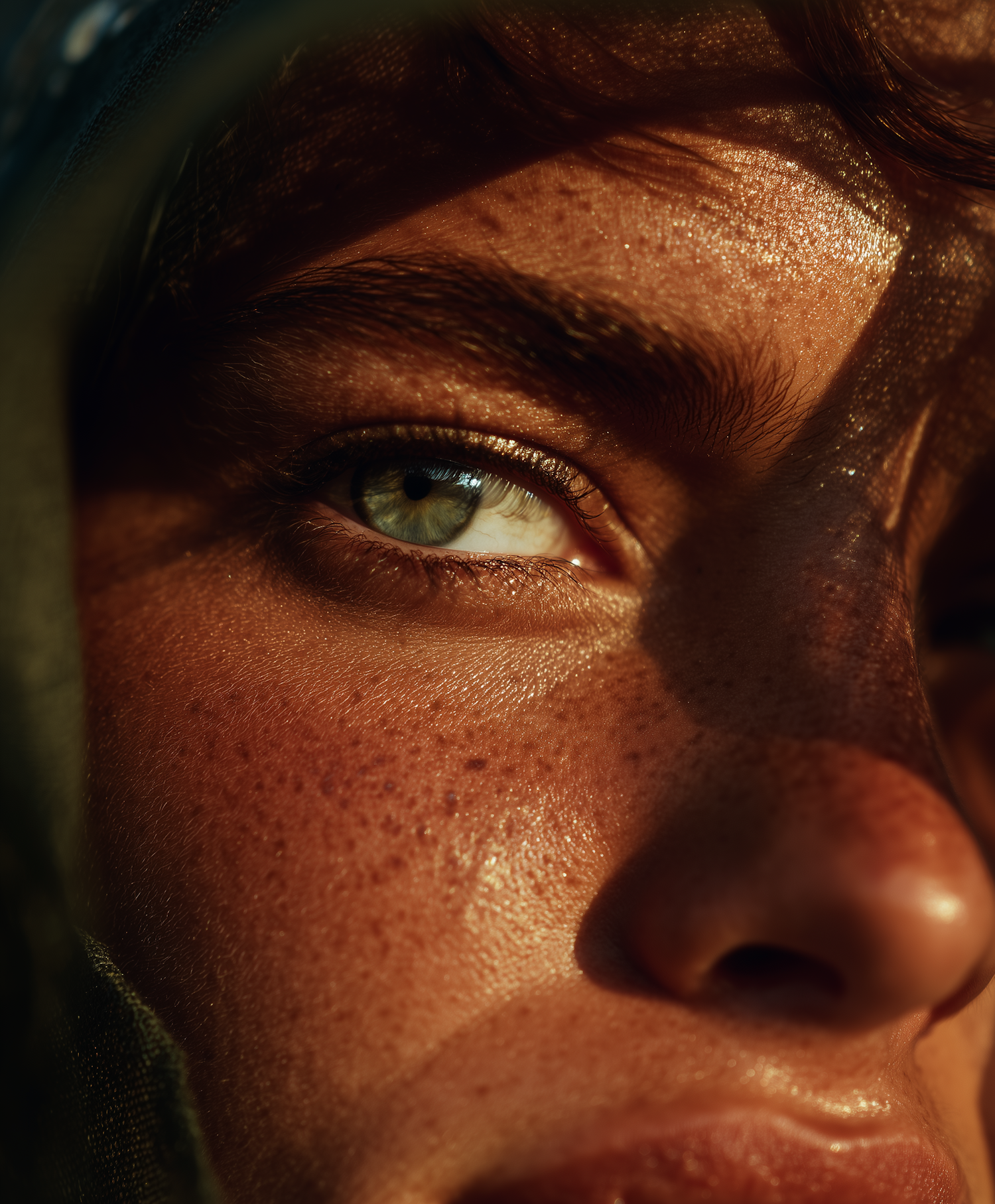 Close-up of a freckled face with green eyes, dramatic lighting, and textured skin, creating an artistic and intimate portrait.