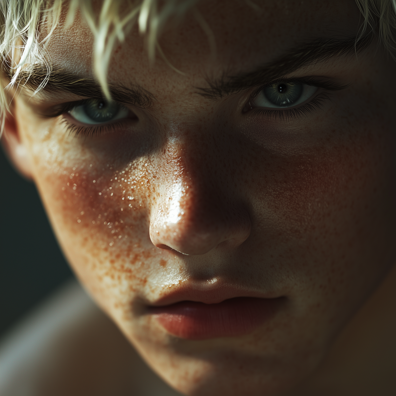 A hyper-realistic close-up of a freckled face with light hair and piercing eyes, showcasing intricate textures and details.