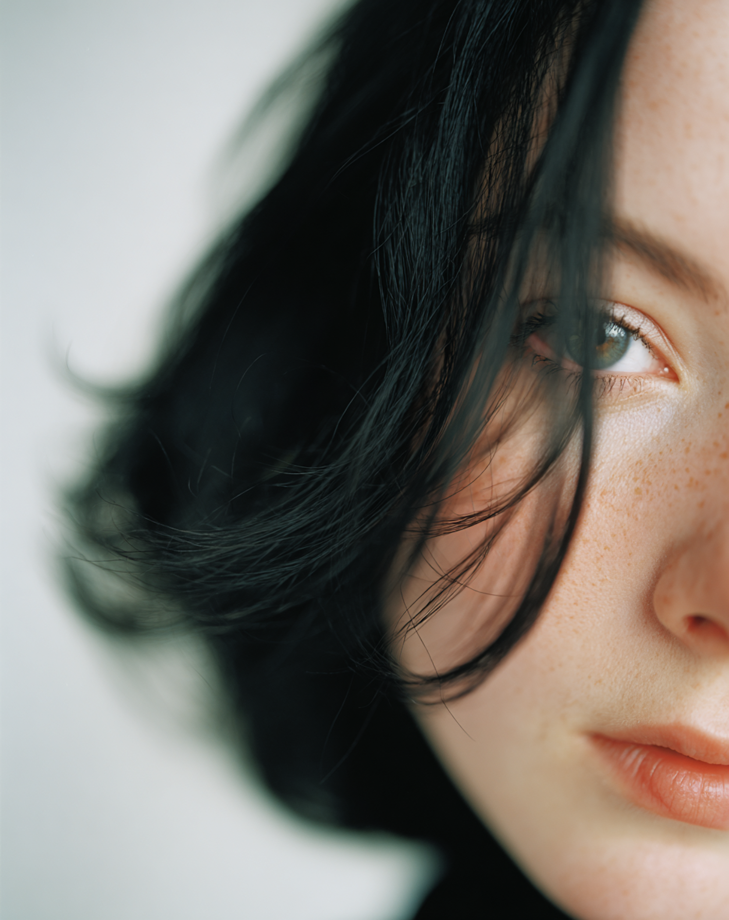 Close-up of a freckled face with black hair and light eyes, creating an intimate and artistic portrait with soft focus on the background.