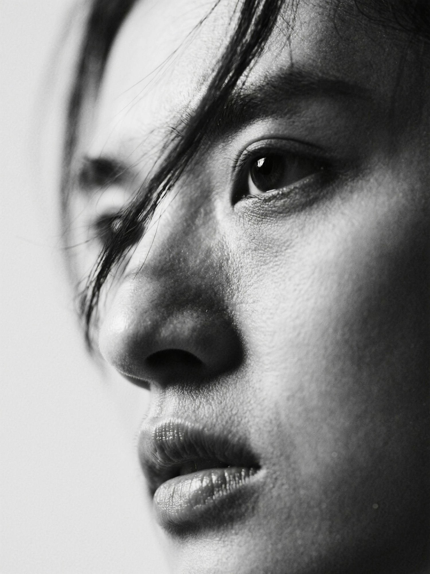 Black-and-white close-up of a person's face, highlighting their eye, nose, and lips with striking detail and artistic lighting.