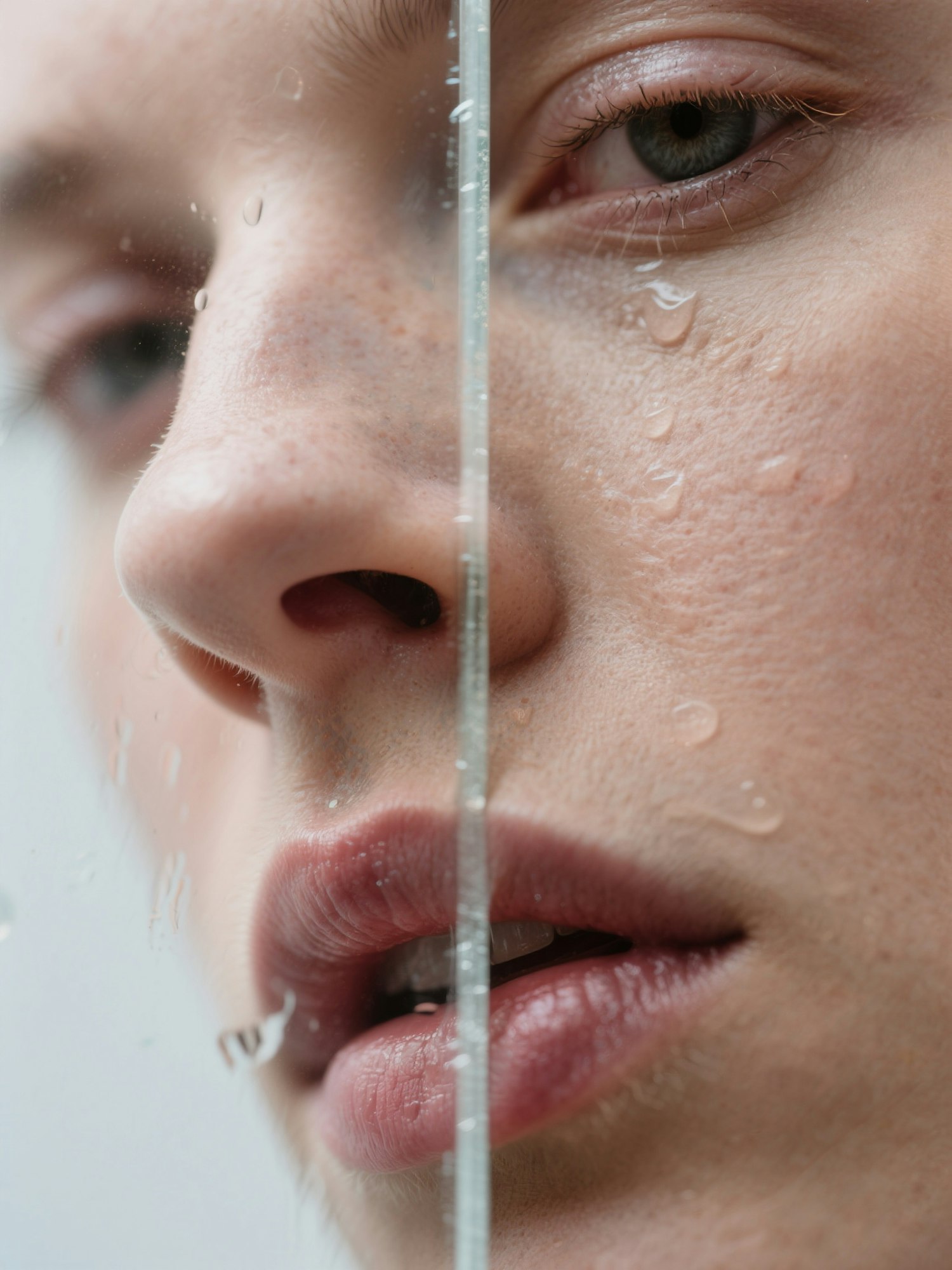 Close-up of a face divided by a glass pane with water droplets, highlighting skin texture, freckles, and green eyes in sharp detail.