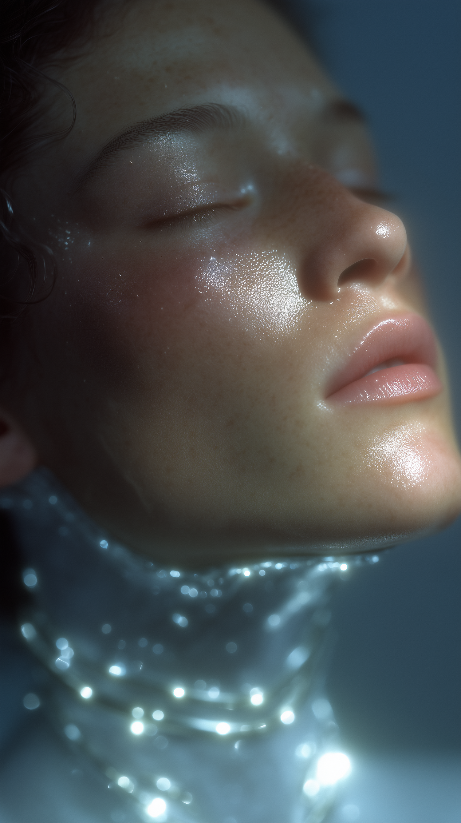 Close-up of a freckled face with dewy skin and glowing light effects around the neck, creating a surreal and ethereal vibe.