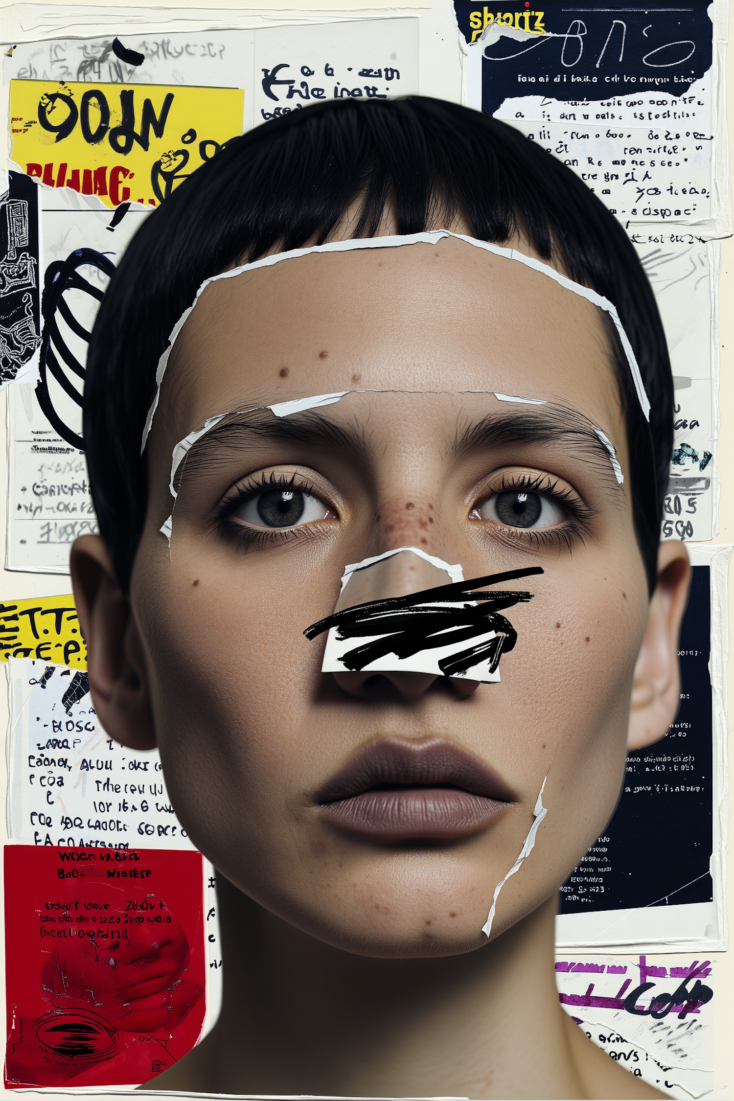 Artistic portrait of a person with torn paper overlays and a collage background of posters and notes, creating a unique visual effect.