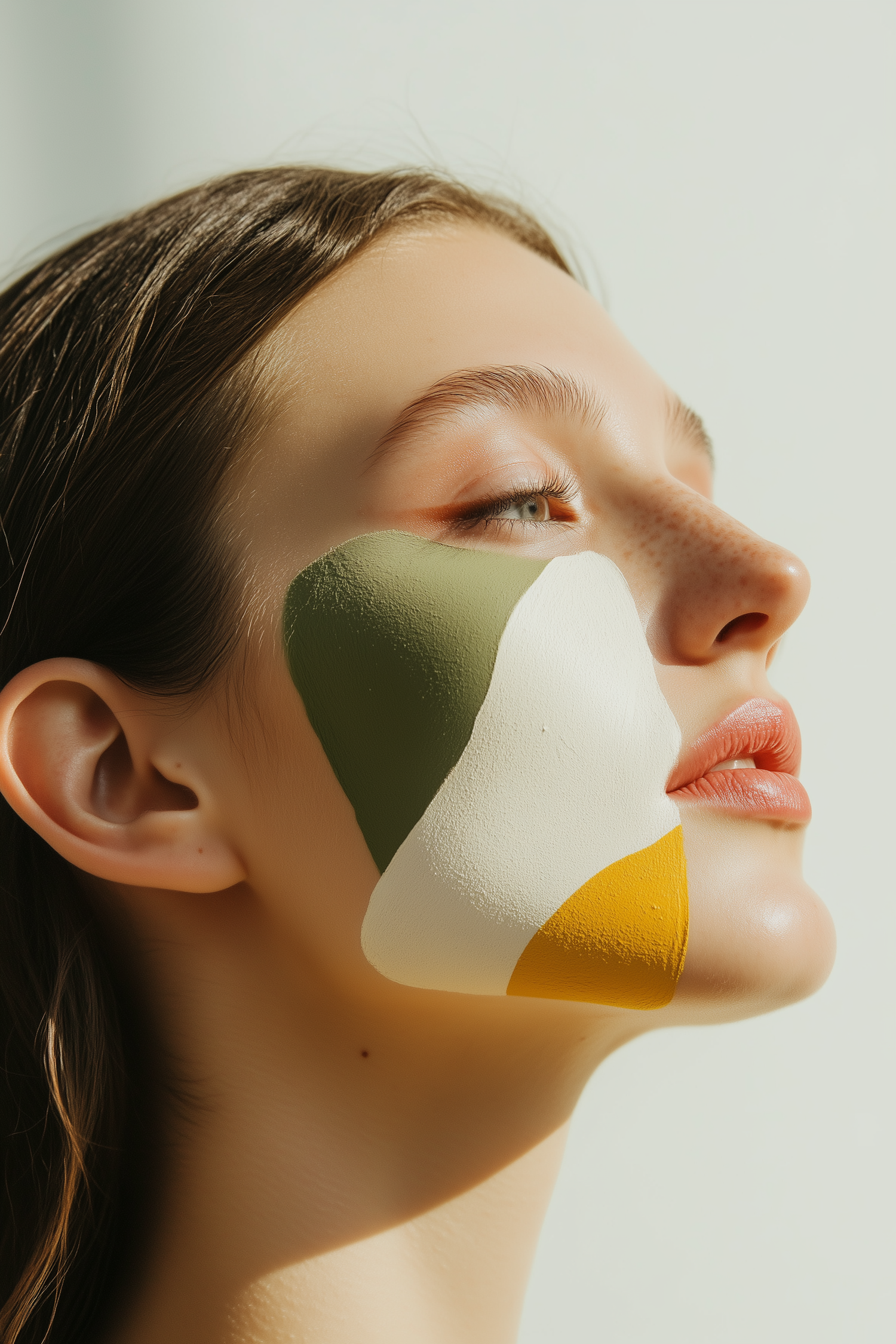 Close-up of a woman with artistic face paint in green, white, and yellow geometric shapes, set against a soft background.