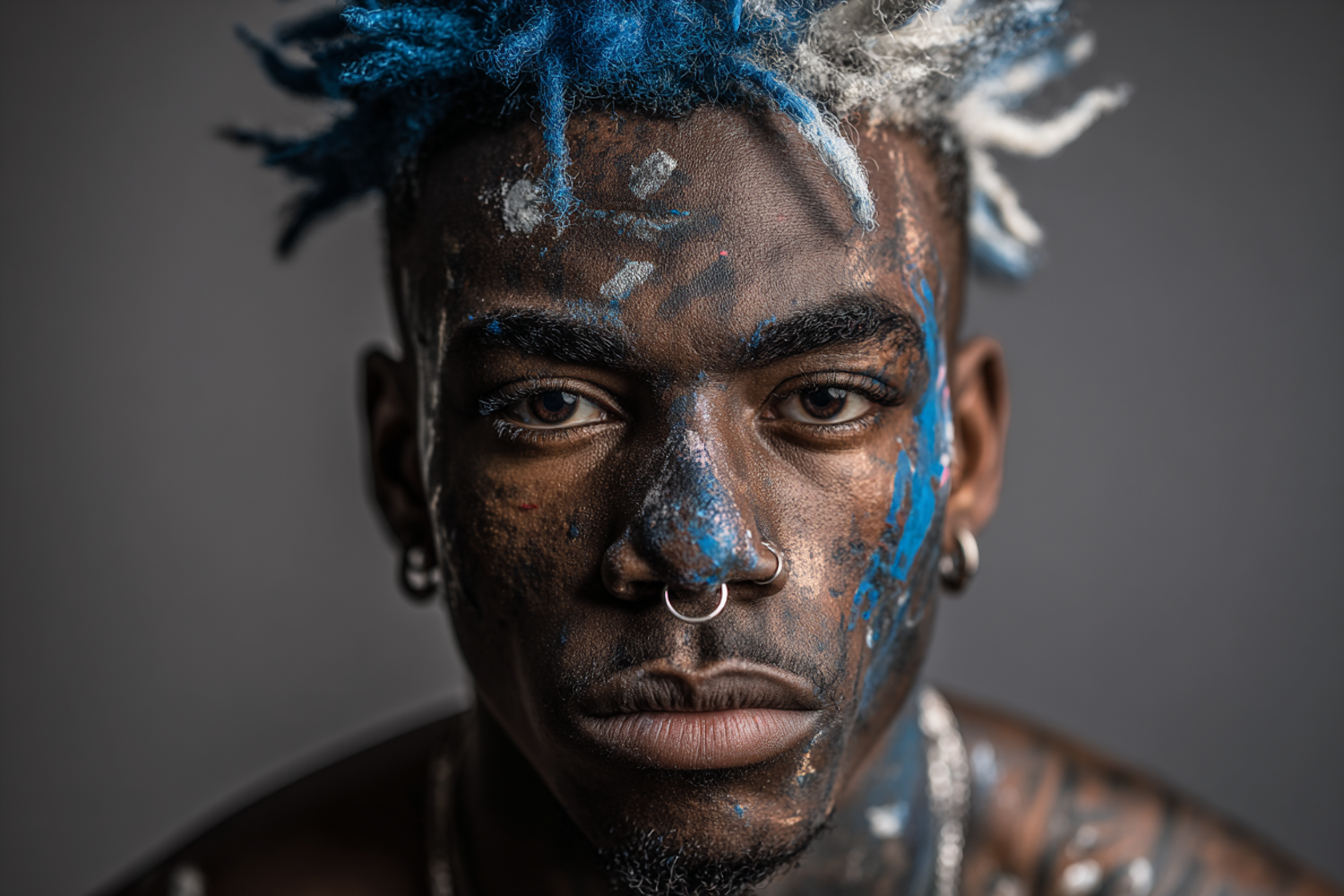 Close-up portrait of a person with painted face and vibrant blue hair, showcasing artistic expression and unique style.