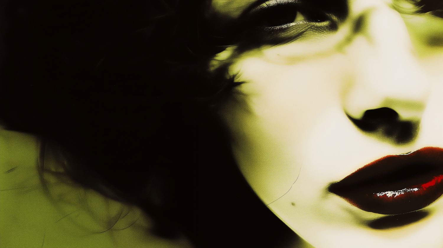Stylized close-up of a face with bold red lips and a greenish-yellow tint, creating a dramatic and mysterious vibe.