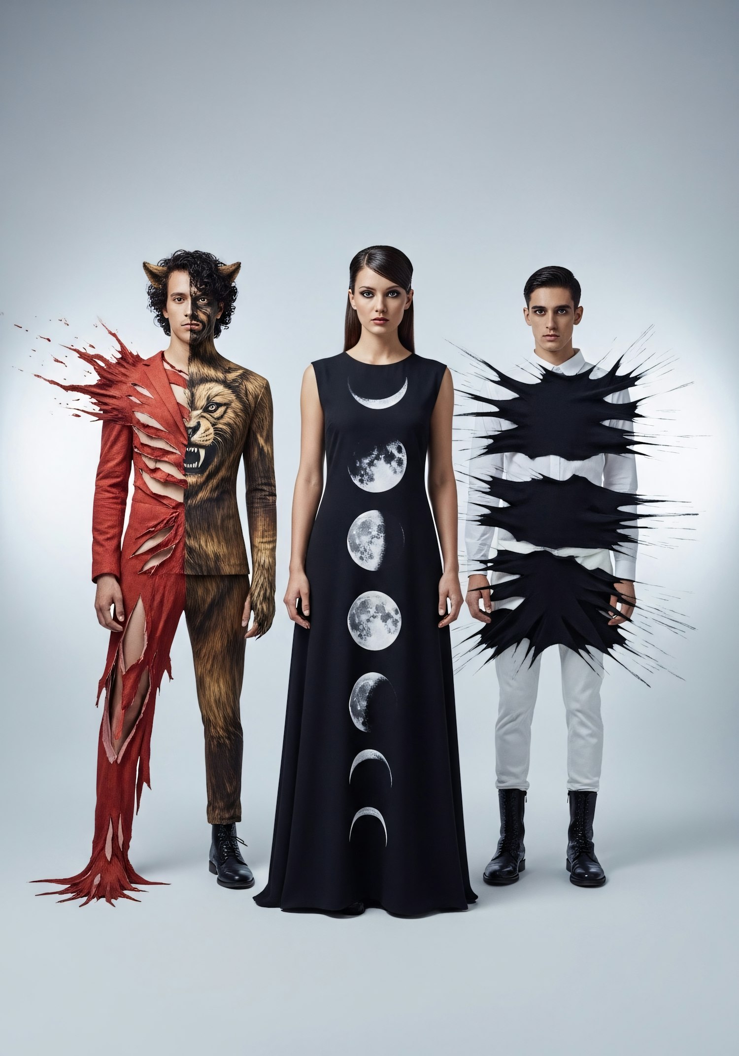 Three models showcase artistic outfits: a lion transformation, moon phases, and abstract spikes, in a minimalist studio setting.