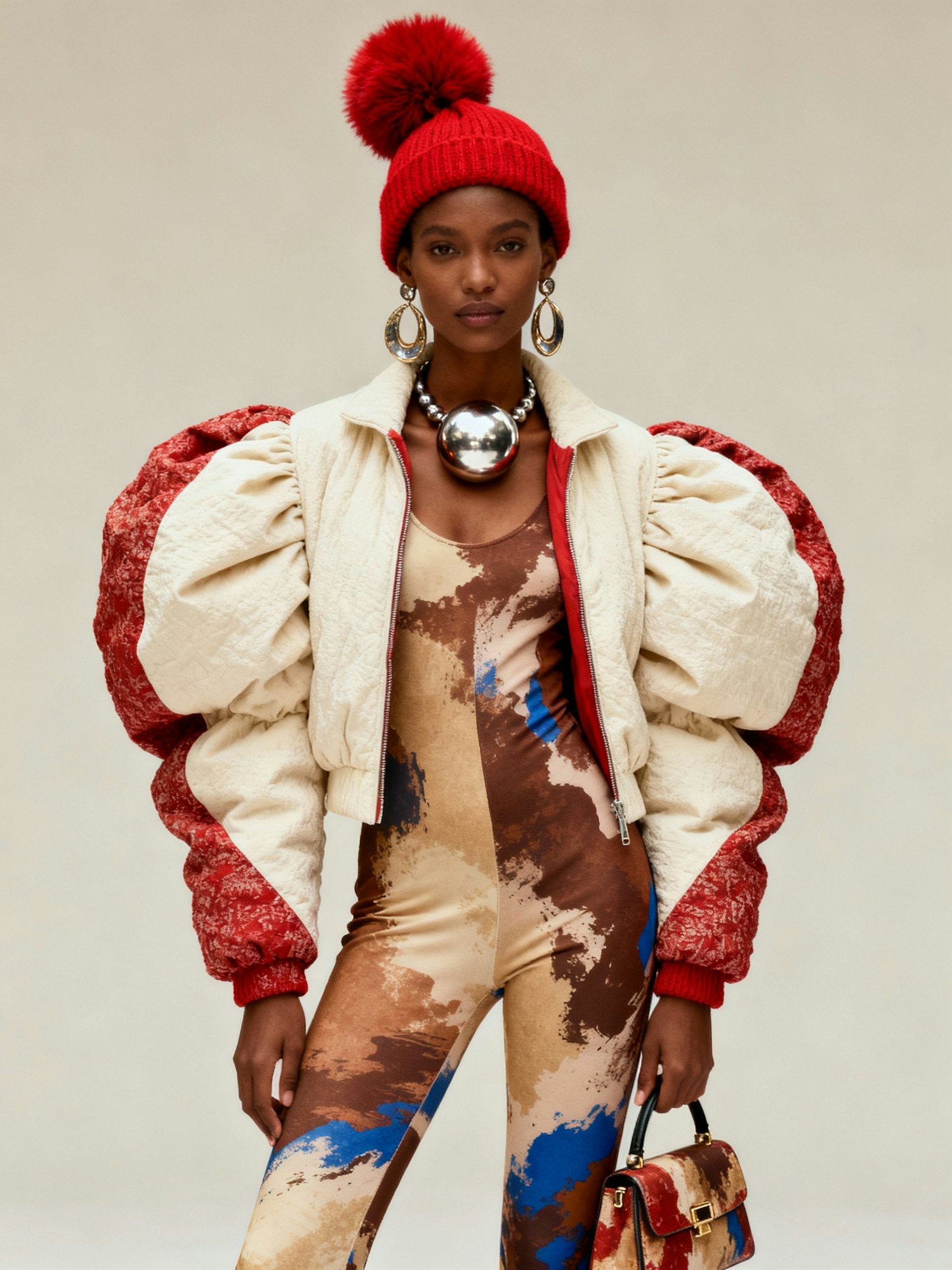 "A confident woman standing against a plain background that complements her warm brown skin tone, wearing a voluminous jacket with exaggerated puffy sleeves in cream and red textured fabric. Underneath, she wears a jumpsuit with an abstract multicolored pattern in earthy tones—brown, beige, and blue. Her accessories include a red knit hat with a large pom-pom, oversized earrings, a chunky metallic necklace made of spherical elements, and a small handbag in matching earthy tones with an abstract print. The look blends eclectic layering, bold texture play, and avant-garde storytelling