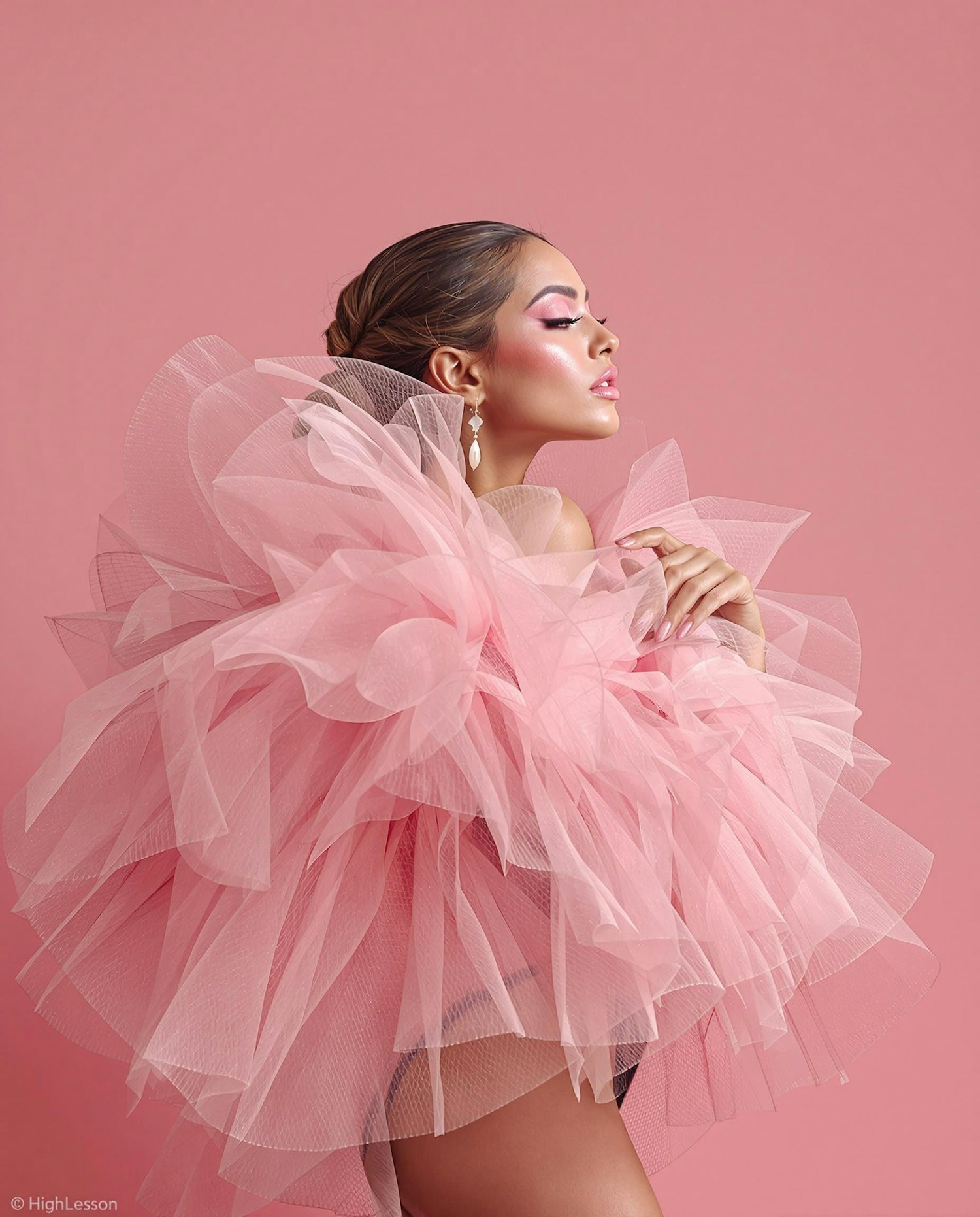 A fashion portrait featuring a woman in a dramatic pink tulle dress against a pink backdrop, showcasing elegance and style.