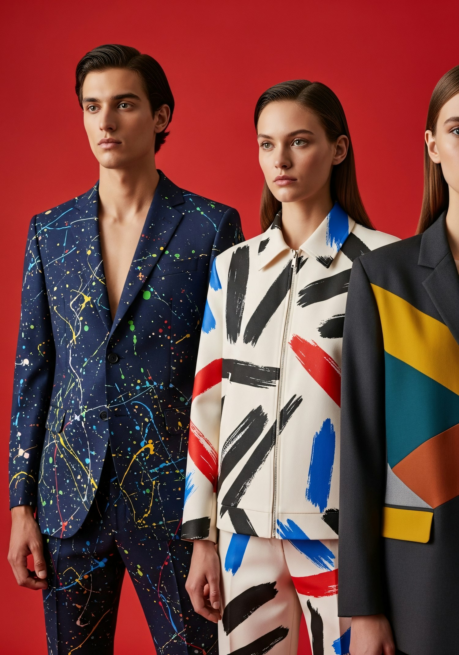 Three individuals in vibrant, artistic outfits stand against a red background, showcasing bold patterns and modern fashion.
