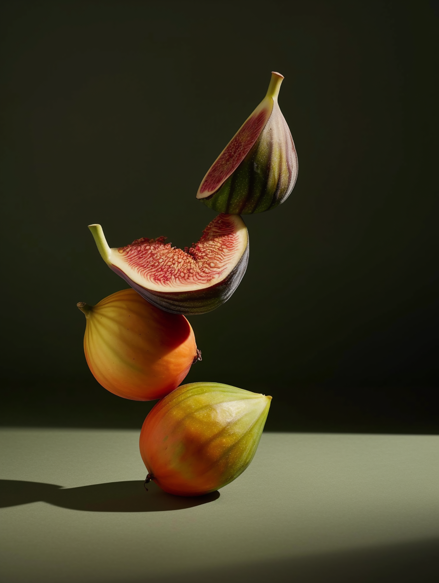 A stack of figs with a sliced one on top, revealing its vibrant interior. Dramatic lighting highlights the green, yellow, and orange hues.