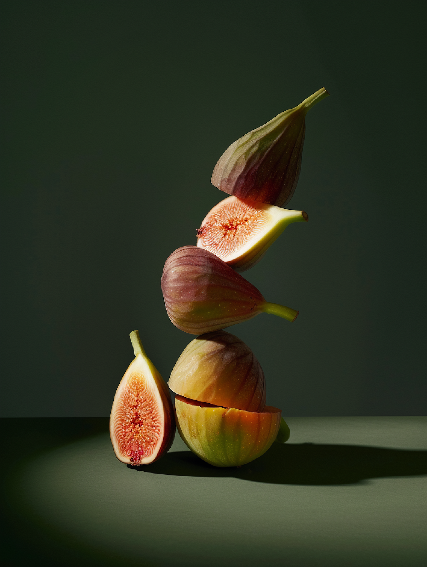 A stack of figs, some sliced open to reveal vibrant interiors, arranged artistically against a dark green background with dramatic lighting.
