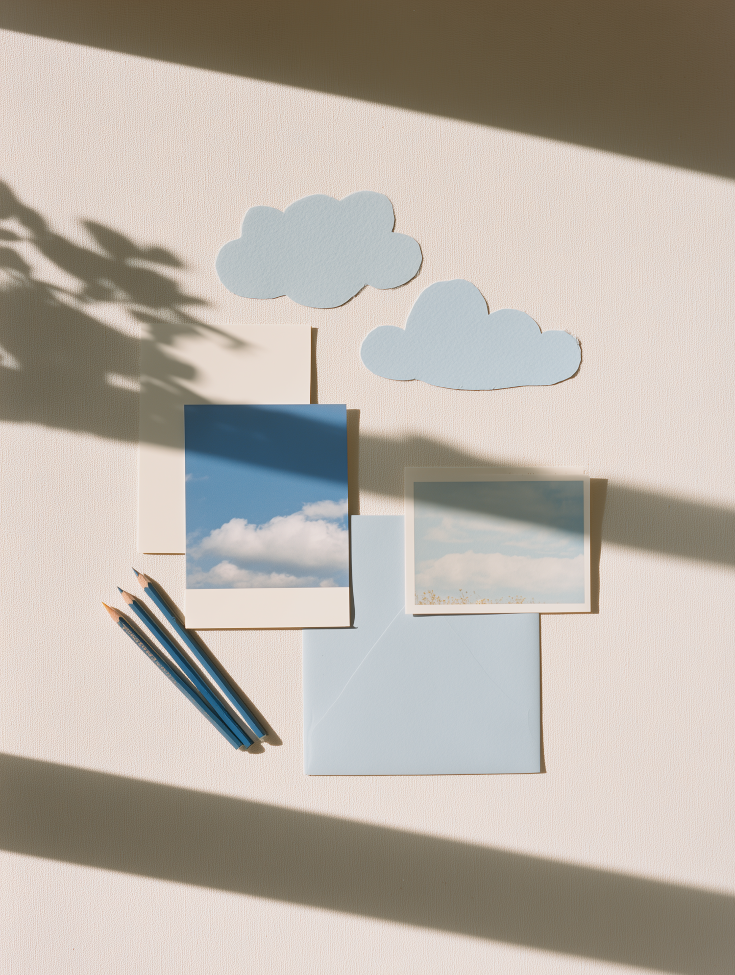A serene flat lay of cloud-themed art materials, including photos, paper cutouts, and pencils, on a beige surface with soft shadows.