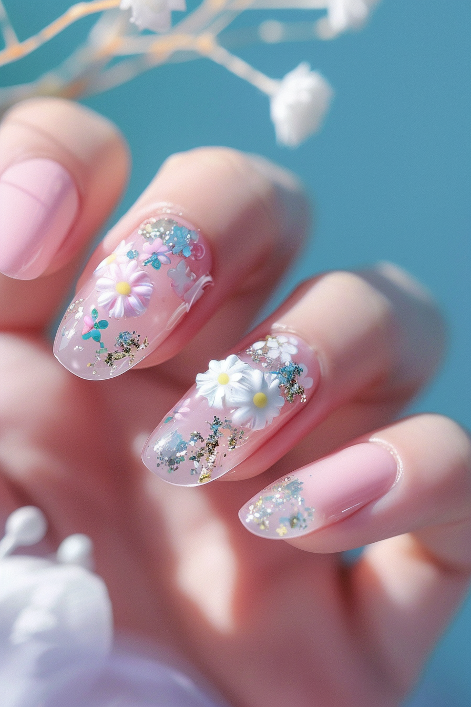 Elegant pink nails with 3D floral designs and glitter accents, set against a soft blue background. Perfect for spring or summer vibes.
