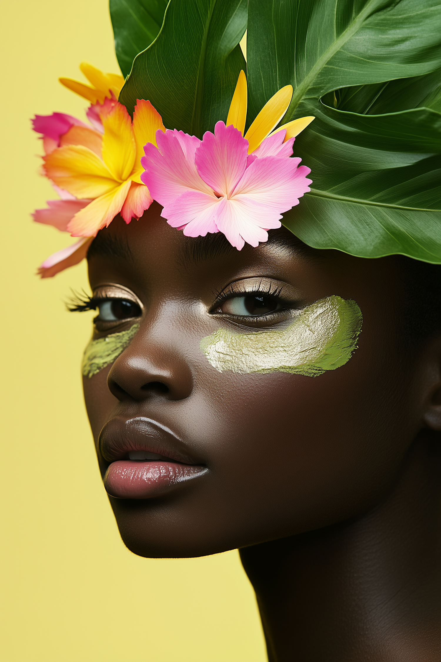 Portrait of a woman with floral headpiece and green face paint, set against a soft yellow background. Vibrant and artistic.
