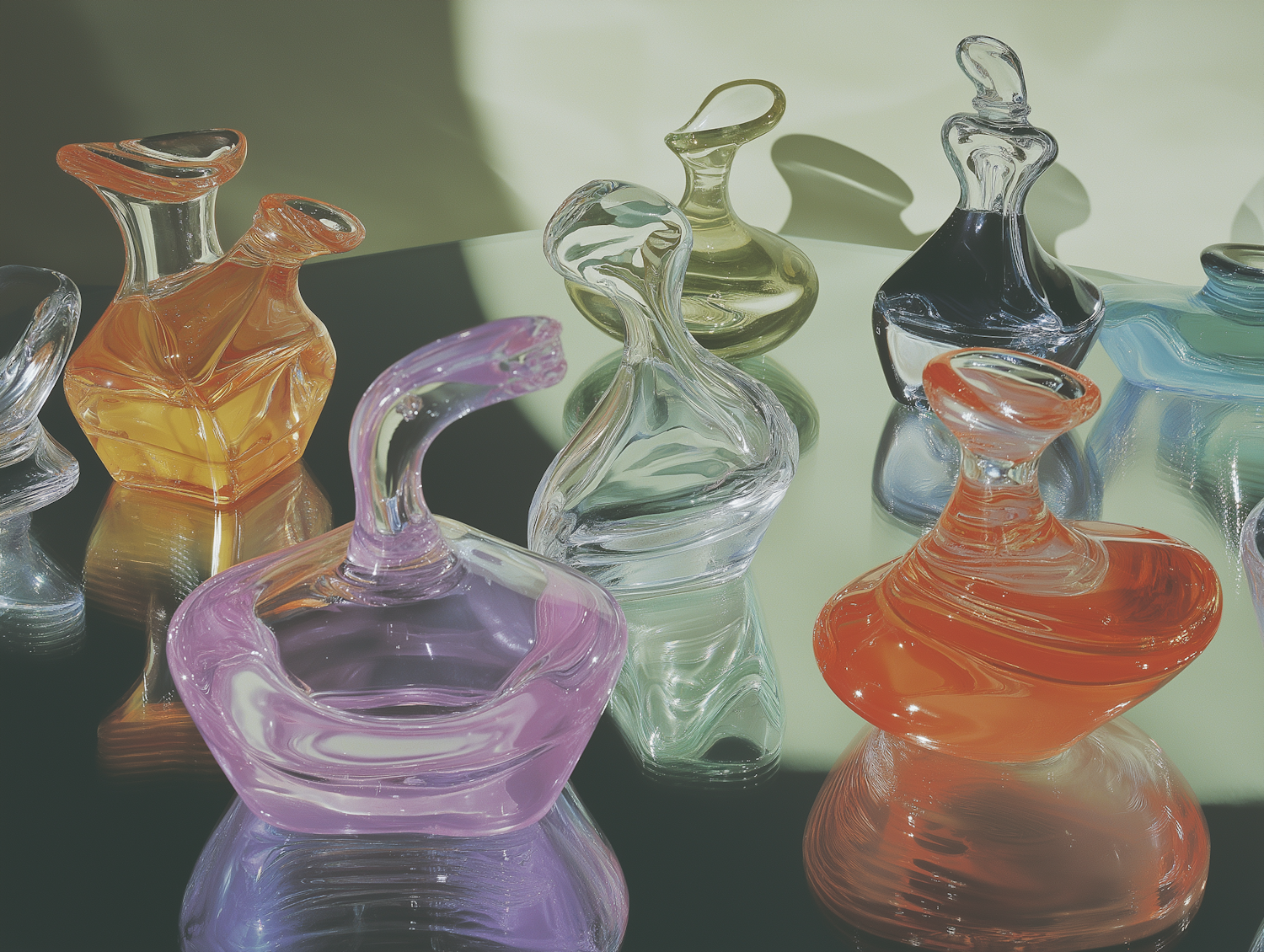 Colorful, uniquely shaped glass bottles on a reflective surface, showcasing vibrant hues and artistic design.