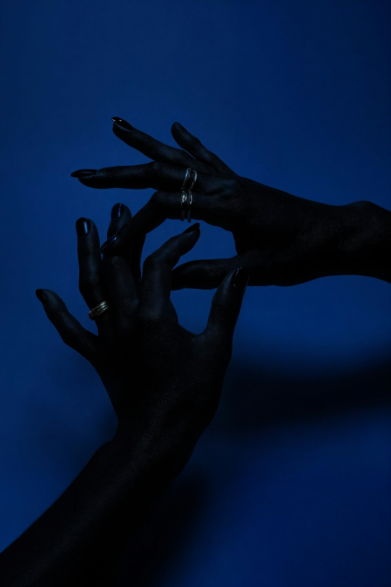 Artistic shot of two hands with silver rings against a deep blue background, showcasing texture and contrast in a minimalist style.