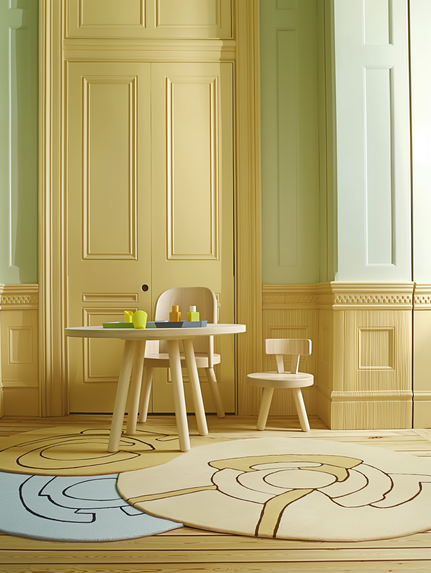 Minimalist room with pastel colors, featuring a round table, chair, and abstract rugs. Elegant paneled walls and playful geometric decor.