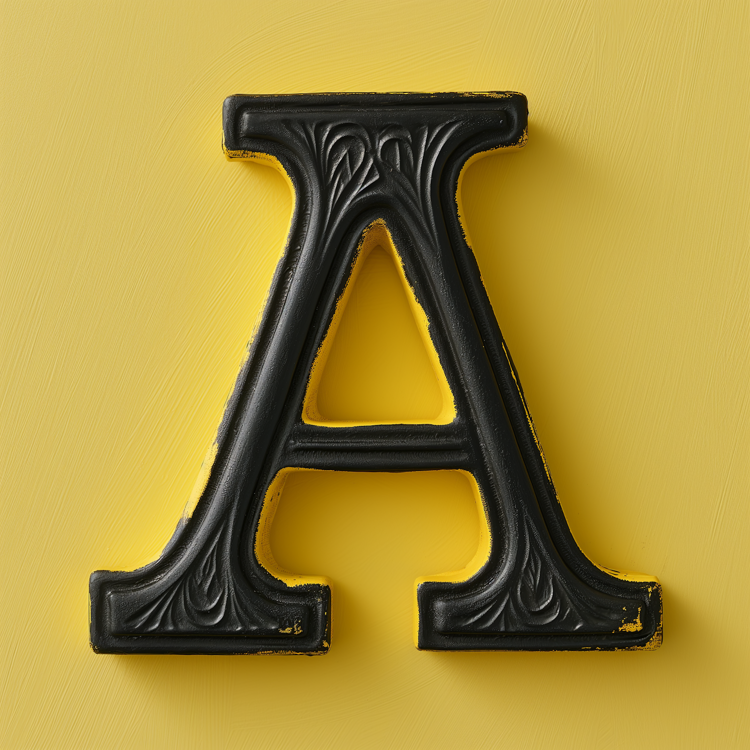 Ornate black letter 'A' with decorative patterns on a vibrant yellow background, creating a bold and elegant visual contrast.