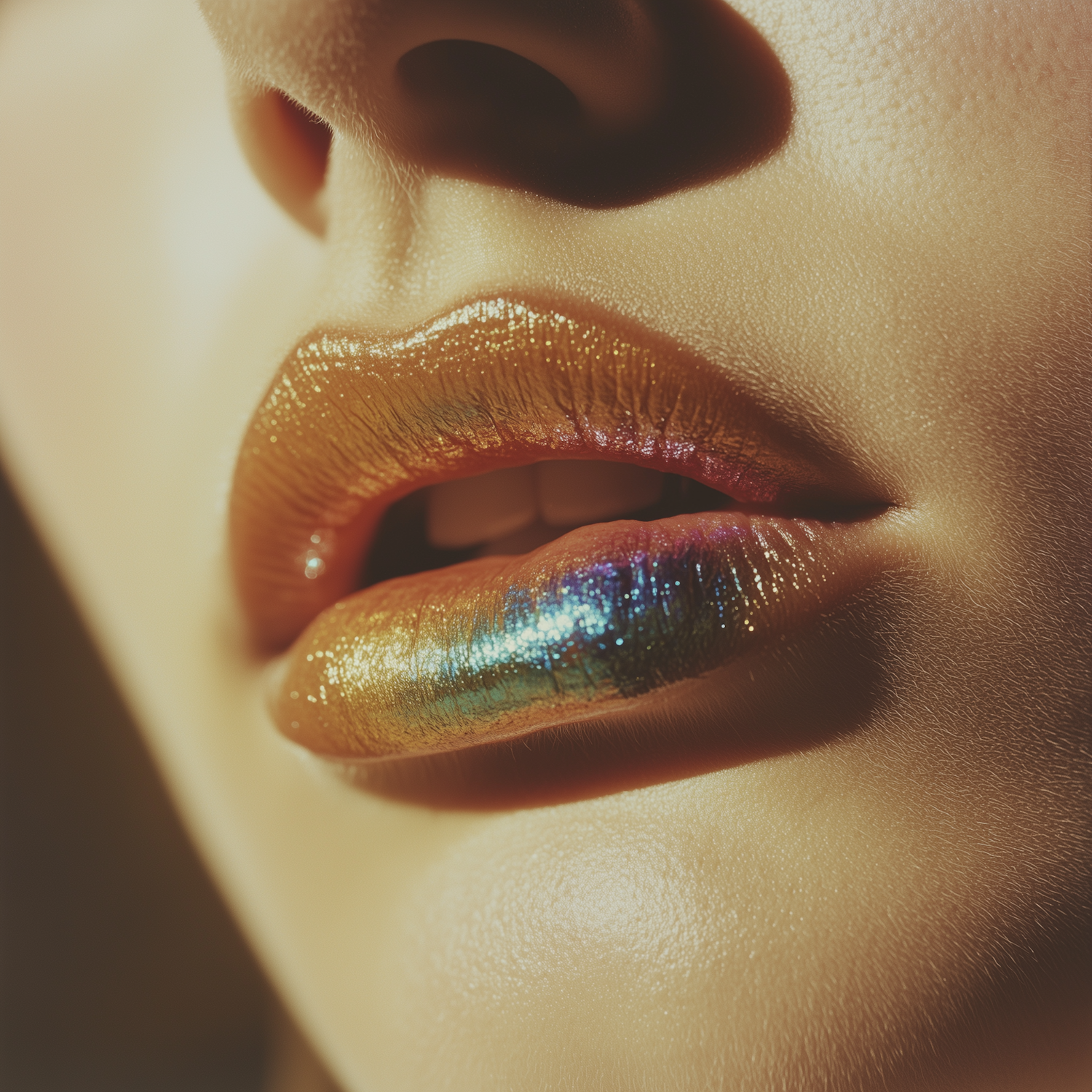 Close-up of glossy, metallic lips with a stunning gradient of gold, green, blue, and purple hues, creating a bold and artistic look.