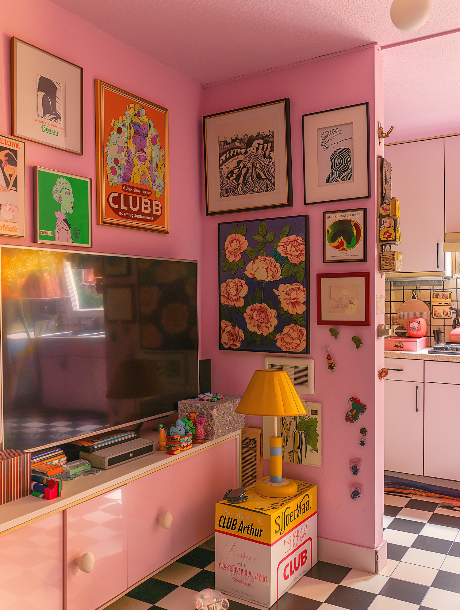 Eclectic room with pink walls, vibrant art, a large TV, and a quirky yellow lamp on a checkered floor. Cozy and artistic vibe.