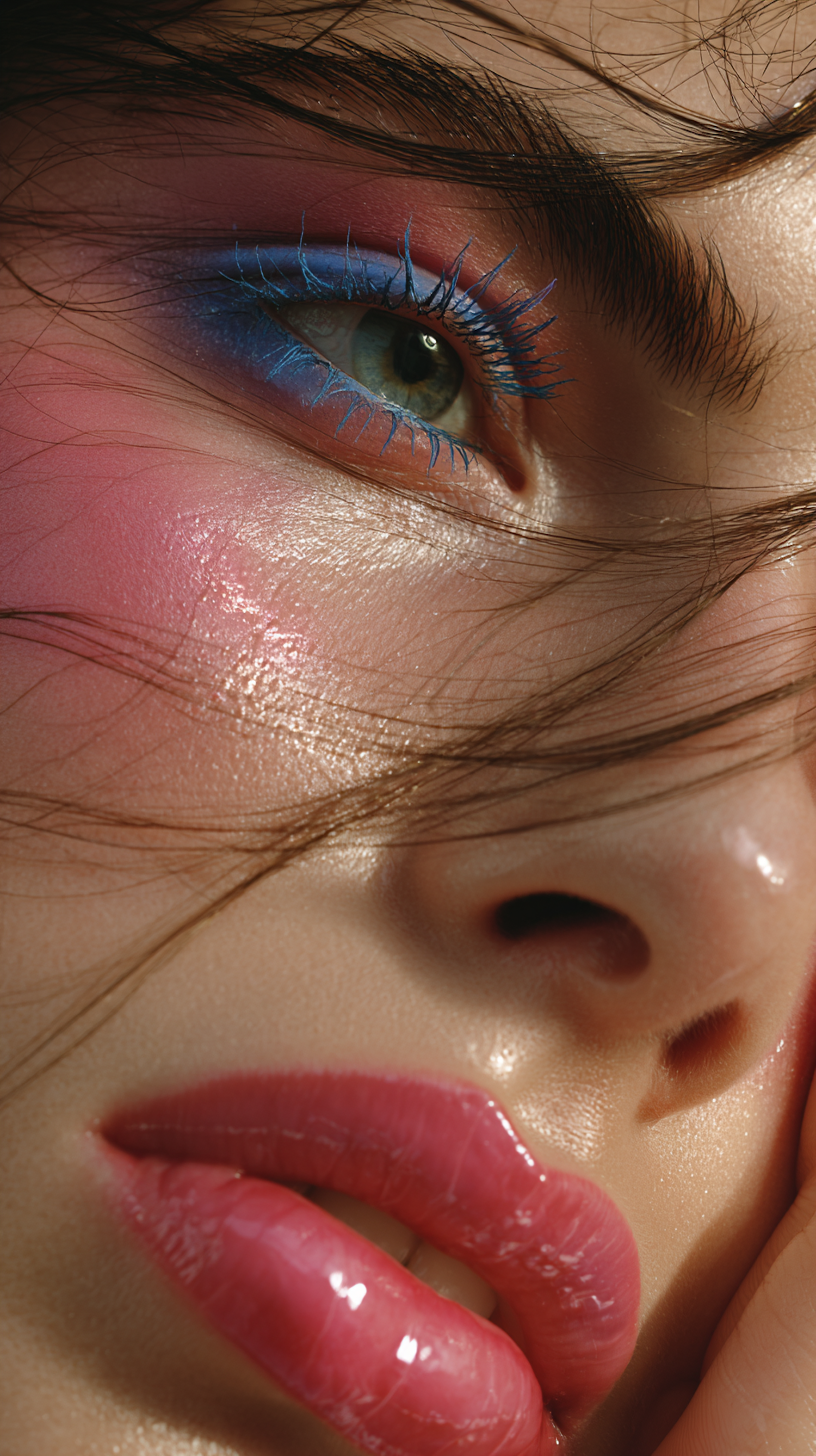 Close-up of a face with vibrant blue mascara, pink eyeshadow, and glossy pink lips, showcasing bold and artistic makeup details.