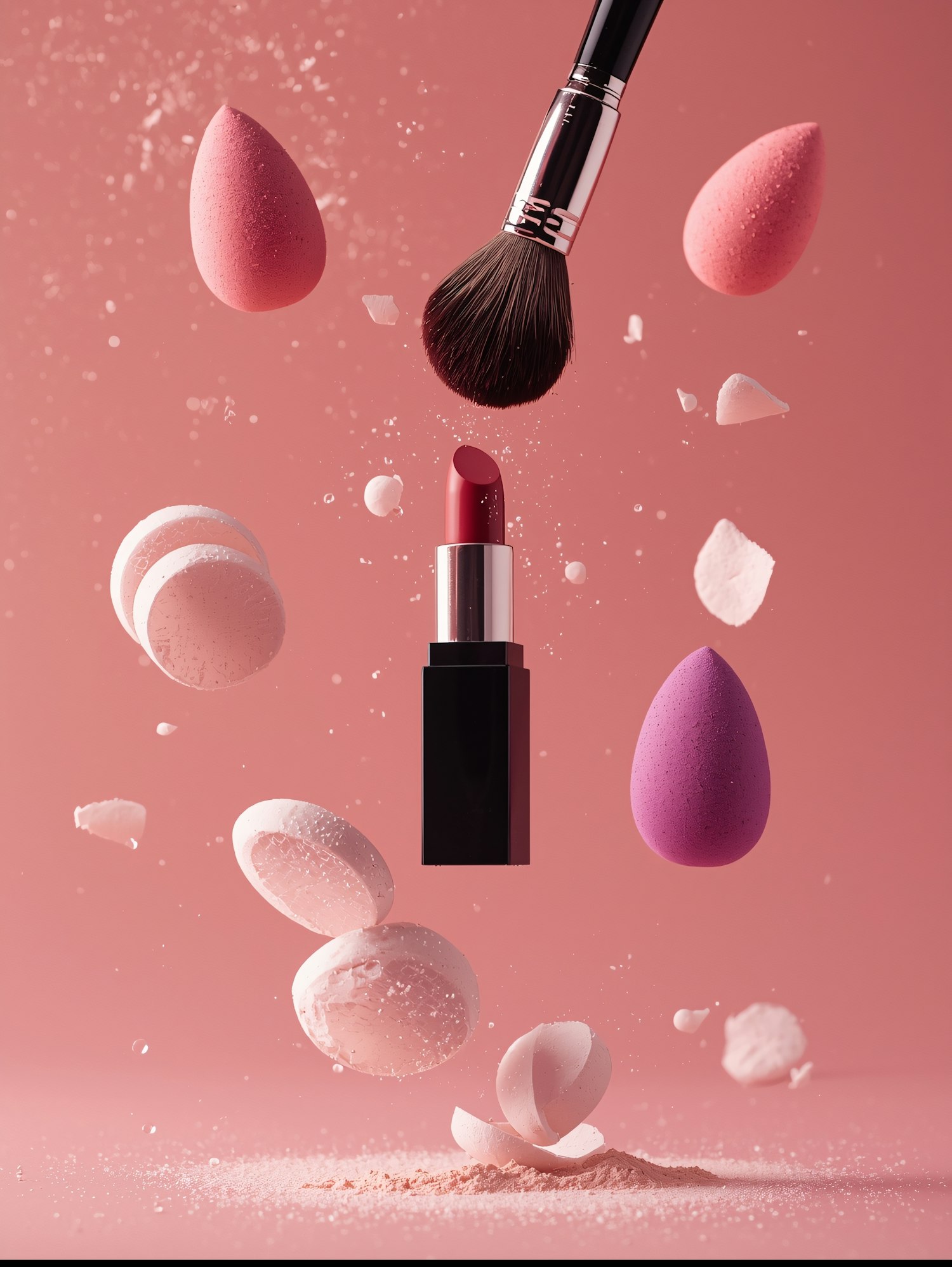Floating makeup items, including lipstick, sponges, and a brush, create a dynamic beauty-themed composition on a pink background.