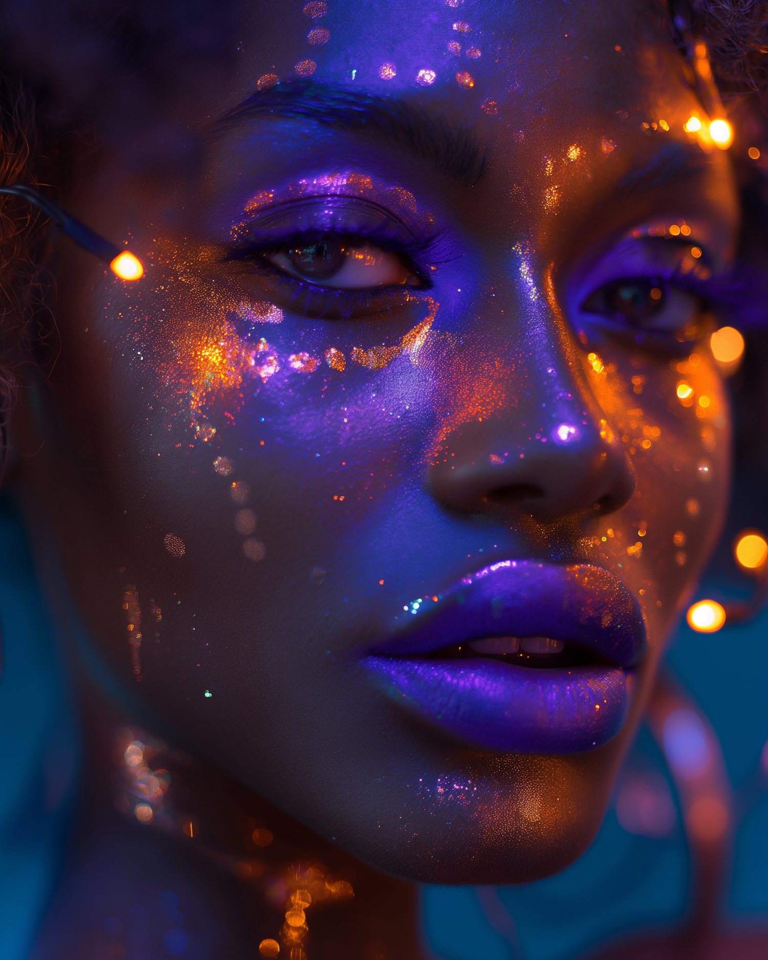 Close-up portrait with glowing purple and orange hues, highlighting eyes and lips. Ethereal lights create a magical, artistic effect.