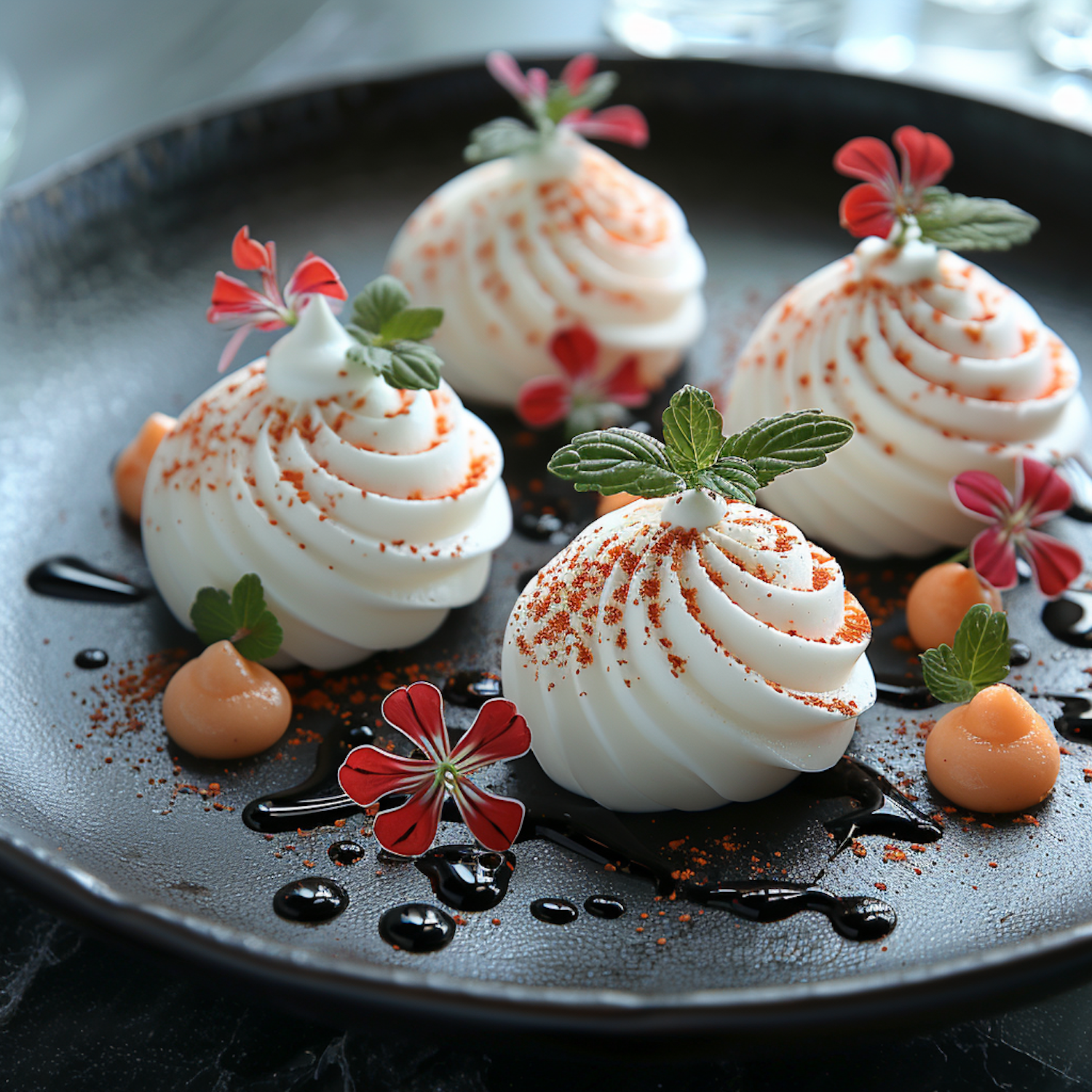 Elegant dessert with swirled mousse, mint, red powder, and flowers on a dark plate. Perfect for gourmet dining.