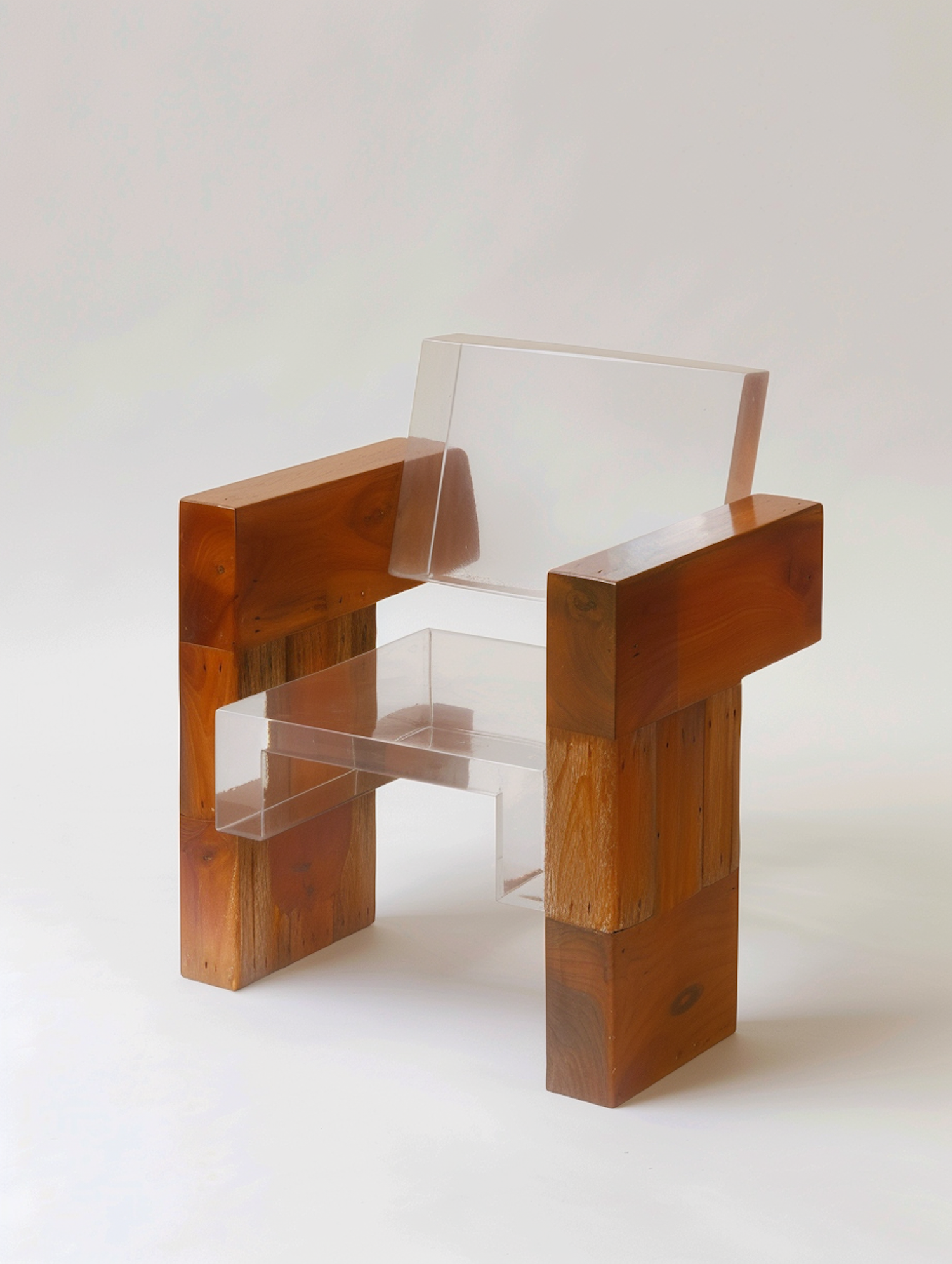 Modern chair with clear acrylic seat and wooden armrests, blending transparency and warmth in a minimalist design.