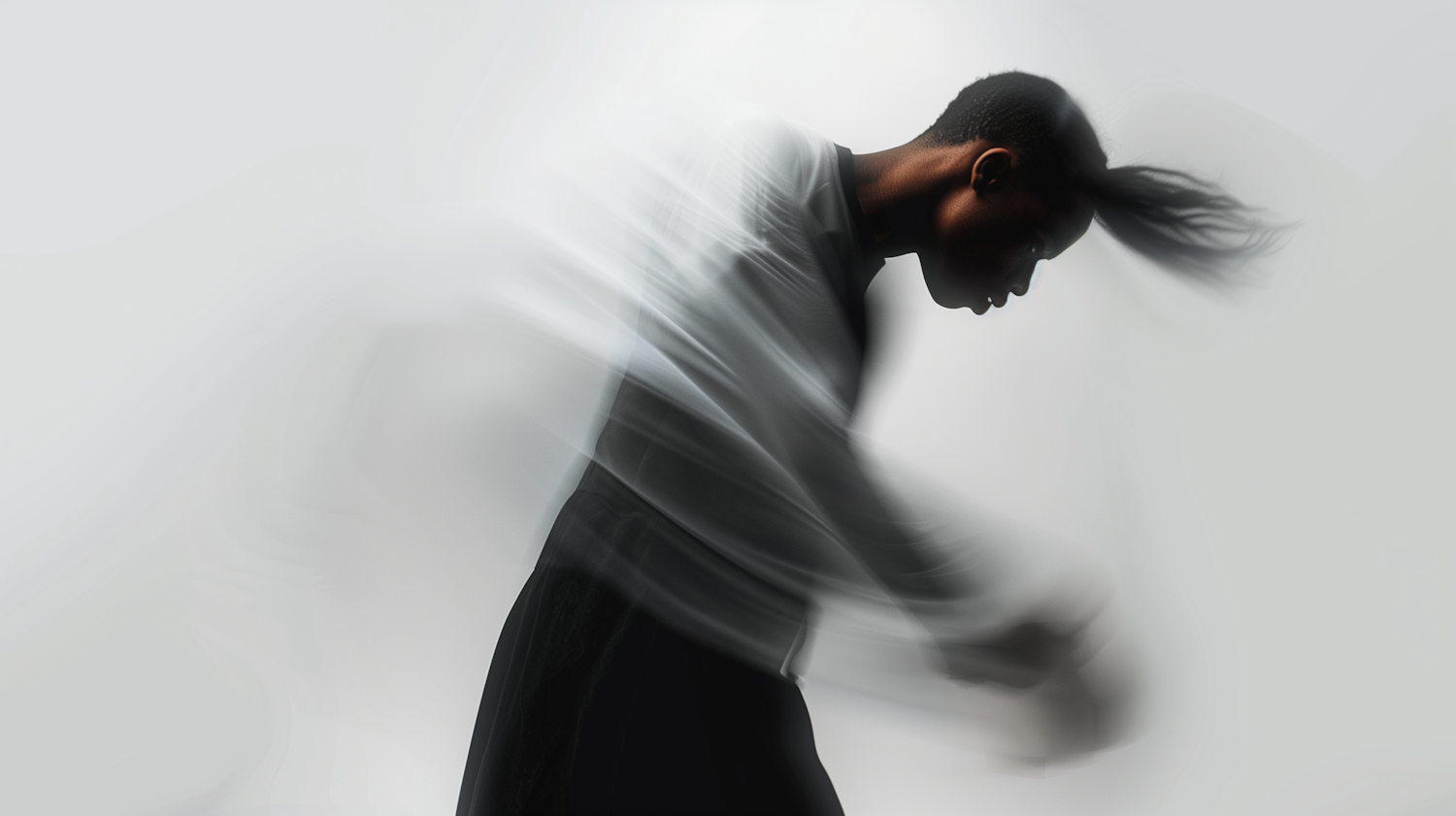 Artistic motion blur of a person in dynamic movement, with flowing hair and clothing against a minimalist white background.
