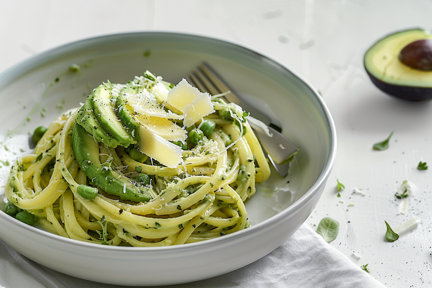 Creamy avocado pasta topped with fresh avocado slices and Parmesan cheese, served in a bowl with a fork on a white table.