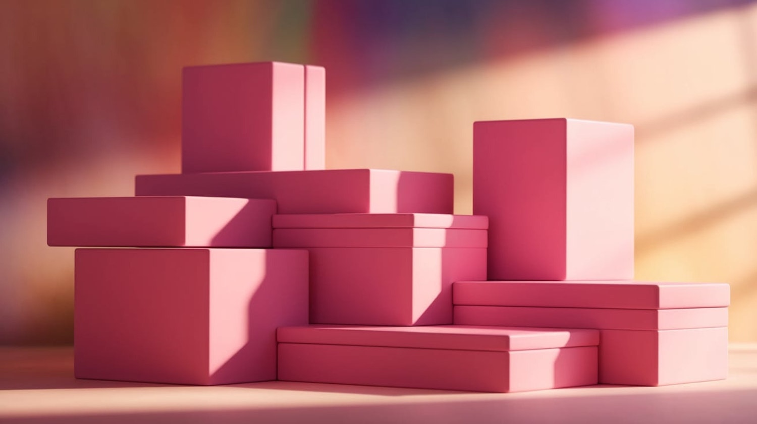 Stacked pink boxes in soft lighting with a dreamy, multicolored background. Perfect for minimalist and aesthetic design inspiration.