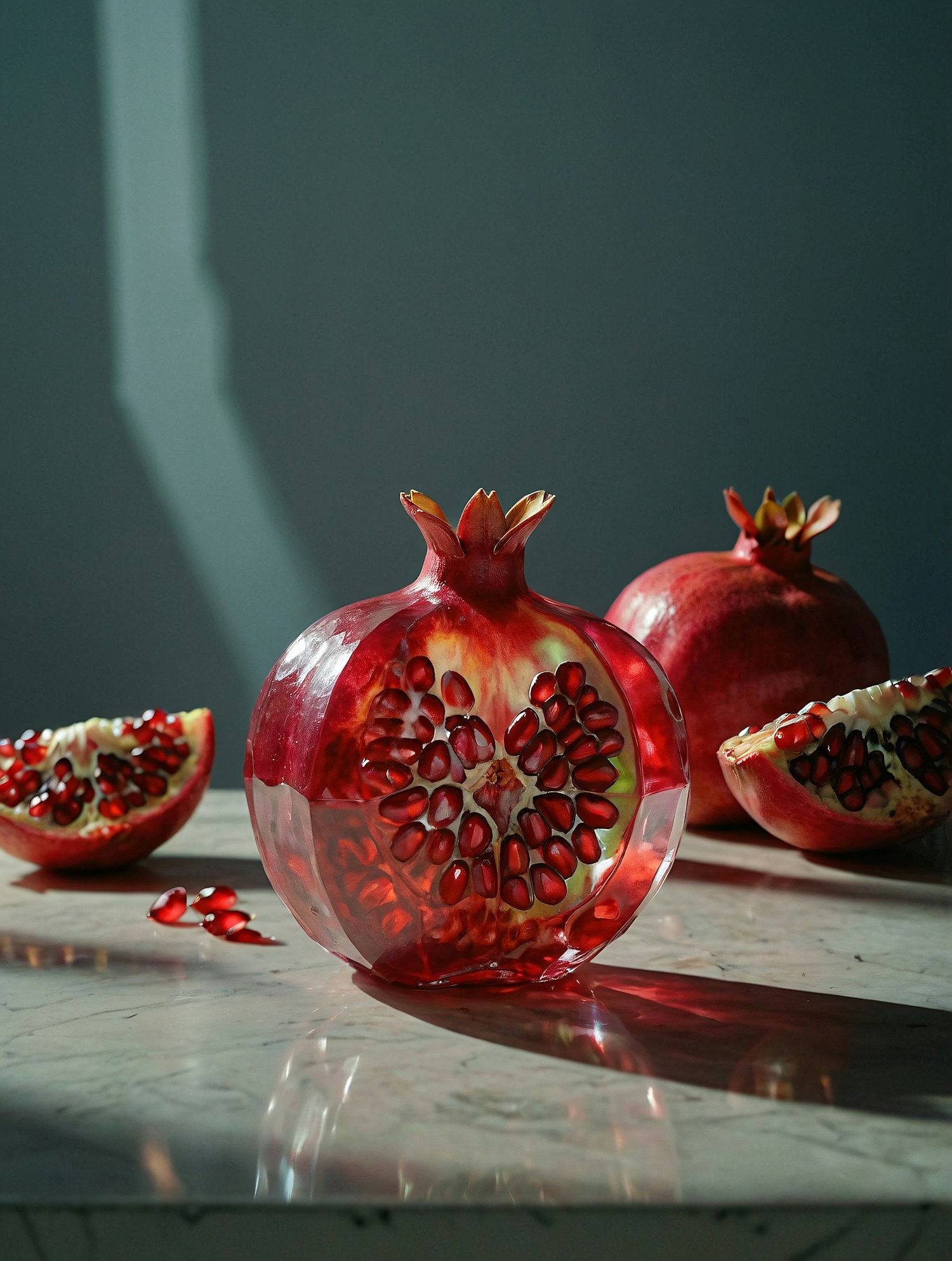 Artistic still life of pomegranates on marble, showcasing vibrant red seeds and rich textures under soft lighting.