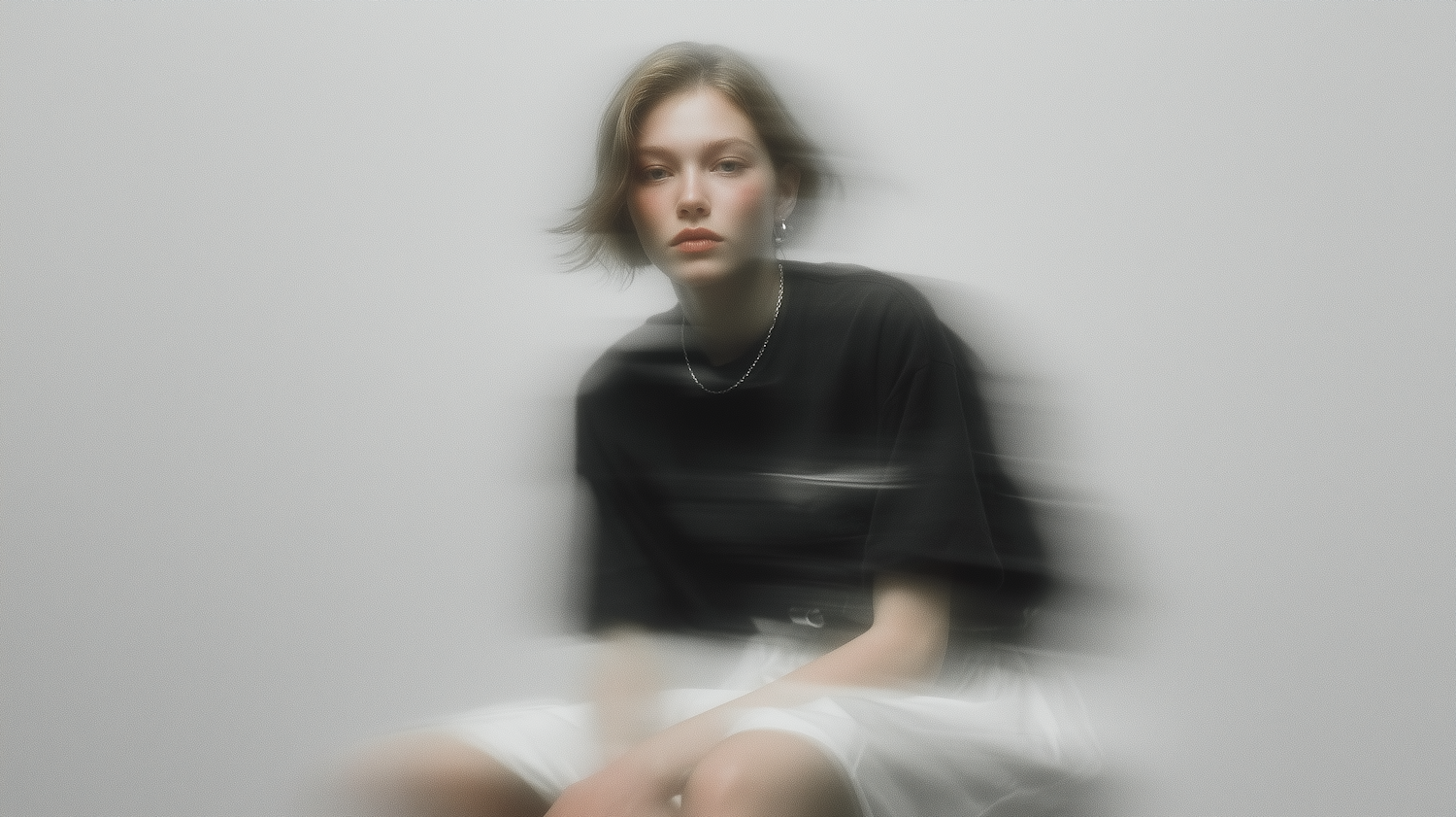 Artistic portrait of a person in a black shirt and white pants, with a blurred motion effect against a plain white background.