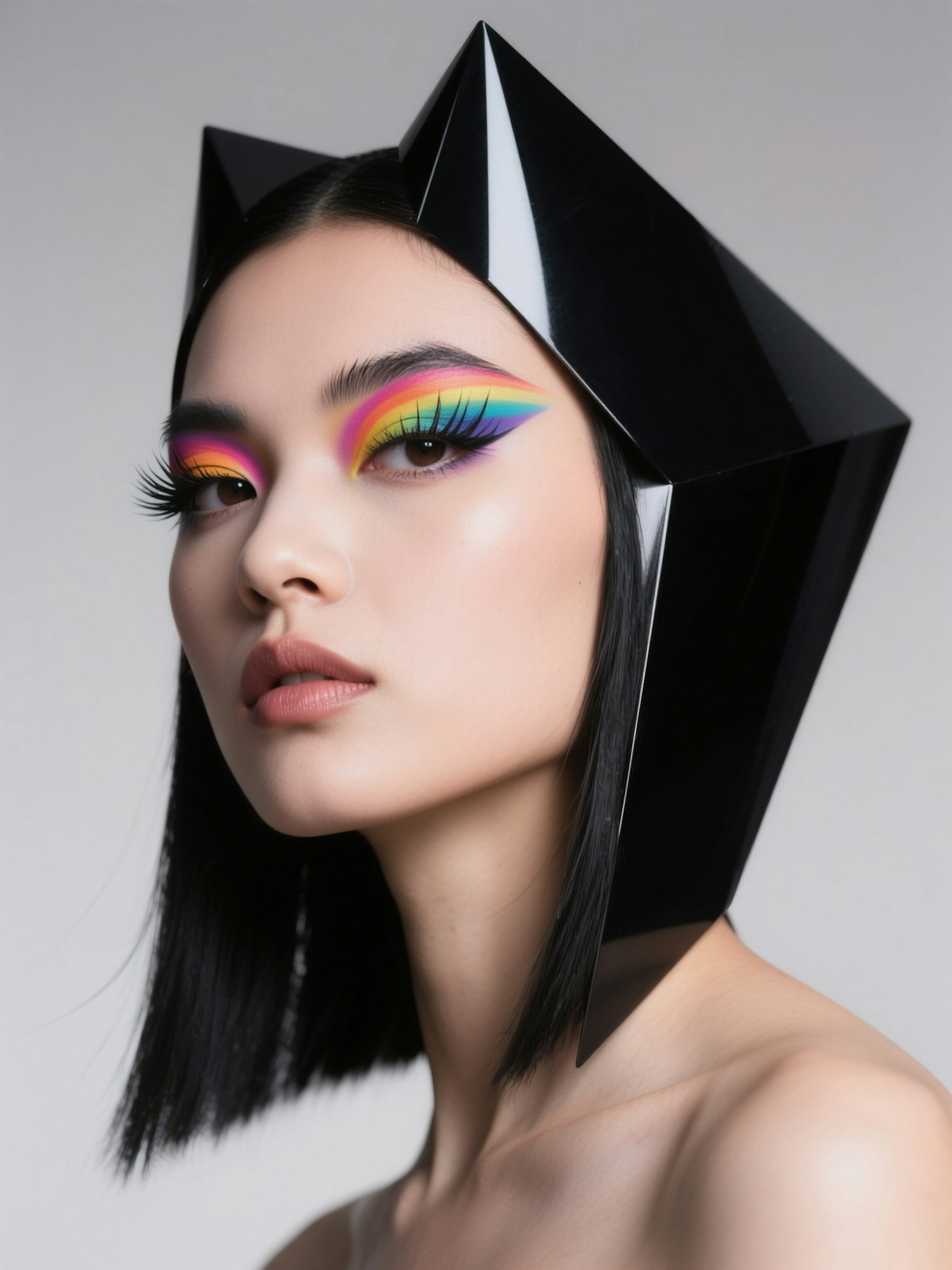 Close-up of a futuristic beauty look with rainbow eyeshadow, dramatic lashes, and geometric black hair under sharp studio lighting. Focus on bold color contrast and hyper-defined facial features with avant-garde attitude.