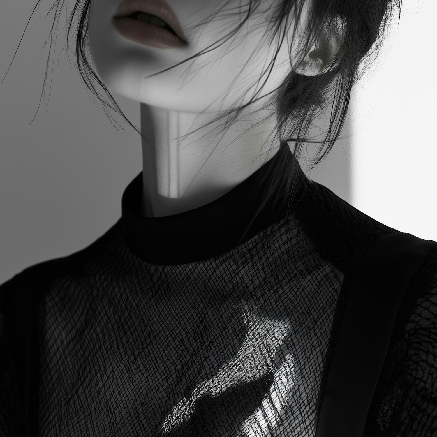 Artistic close-up of a person in a black mesh top, with dramatic lighting highlighting their pale skin and delicate features.