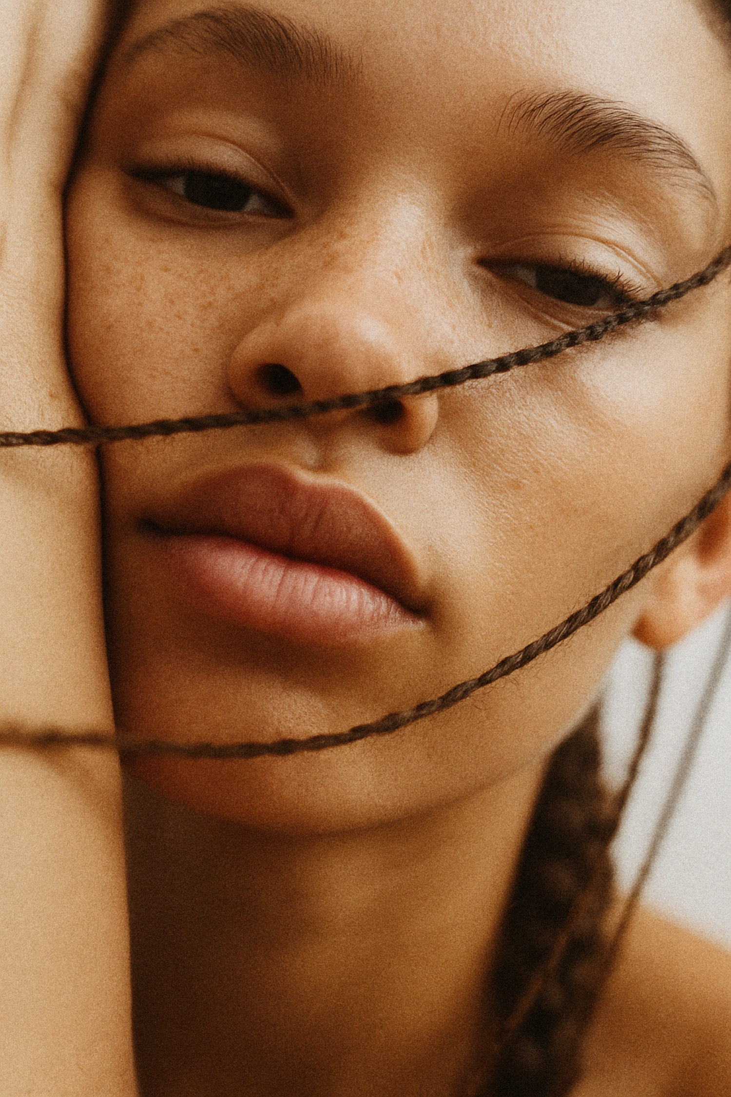 Close-up image of a serene individual with freckles and braided hair, featuring soft lighting and an artistic focus on natural textures.