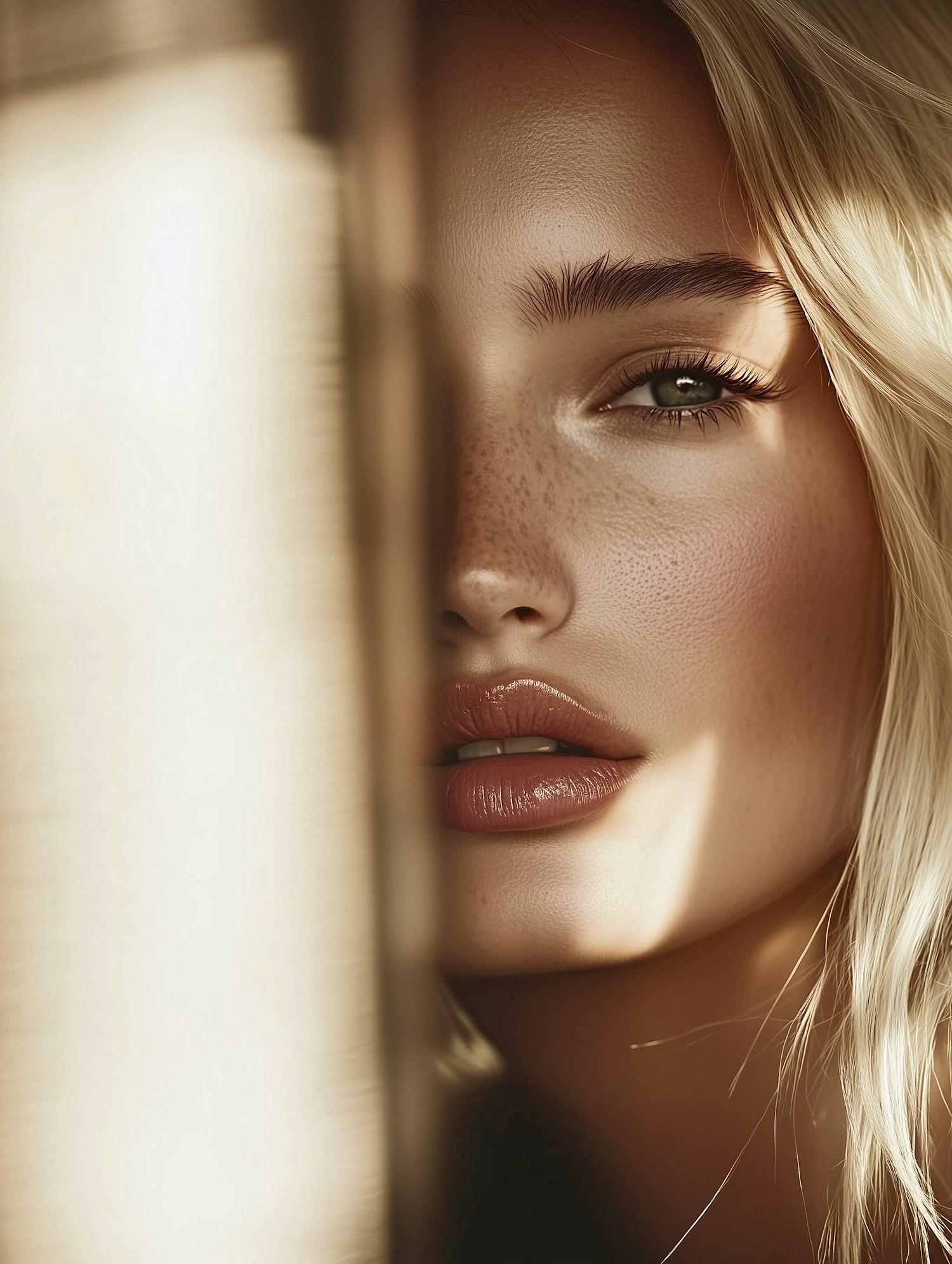 Close-up of a blonde woman with green eyes, freckles, and glossy lips, bathed in warm light with a shadow adding depth and mystery.